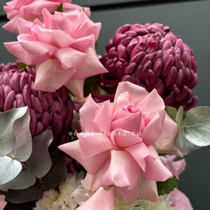 Хризантемы с маттиолой розами эустомой Чика