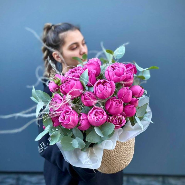 Пионовидные розы в джутовом кашпо