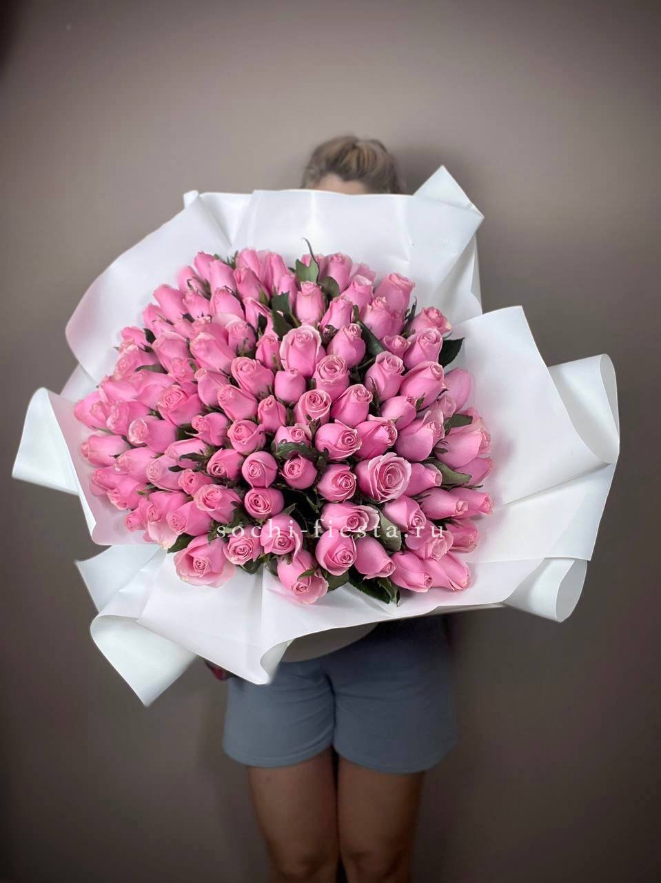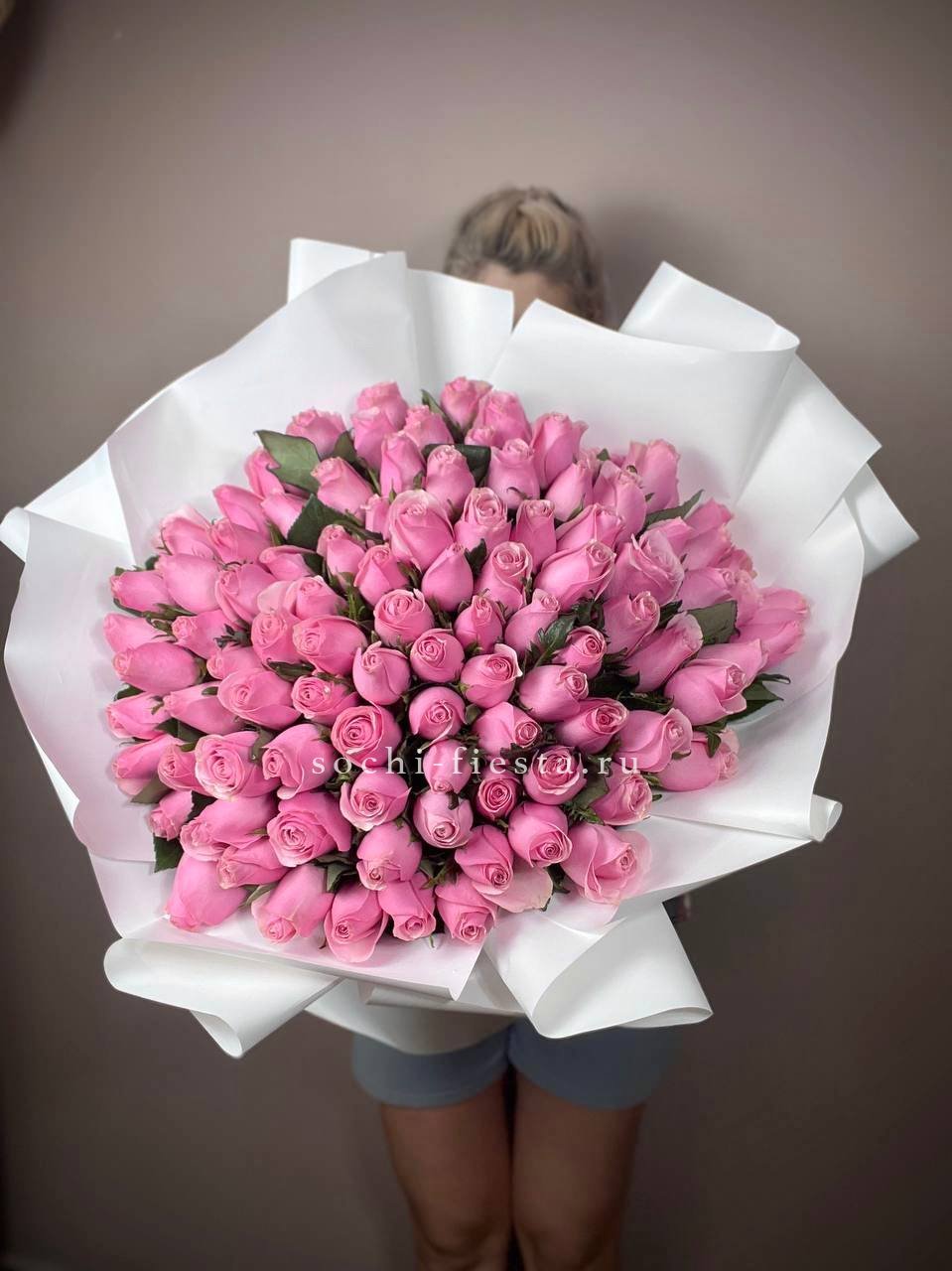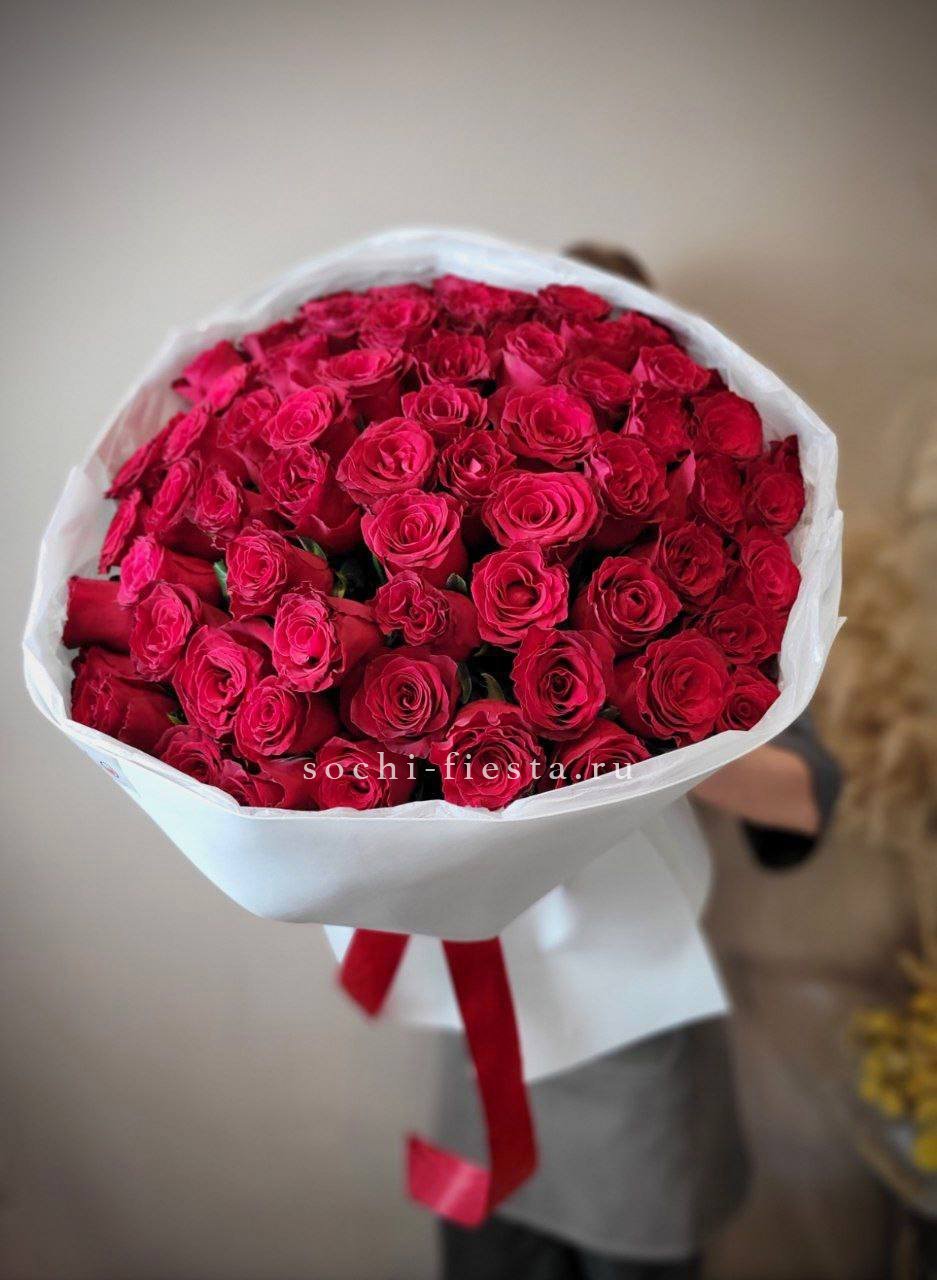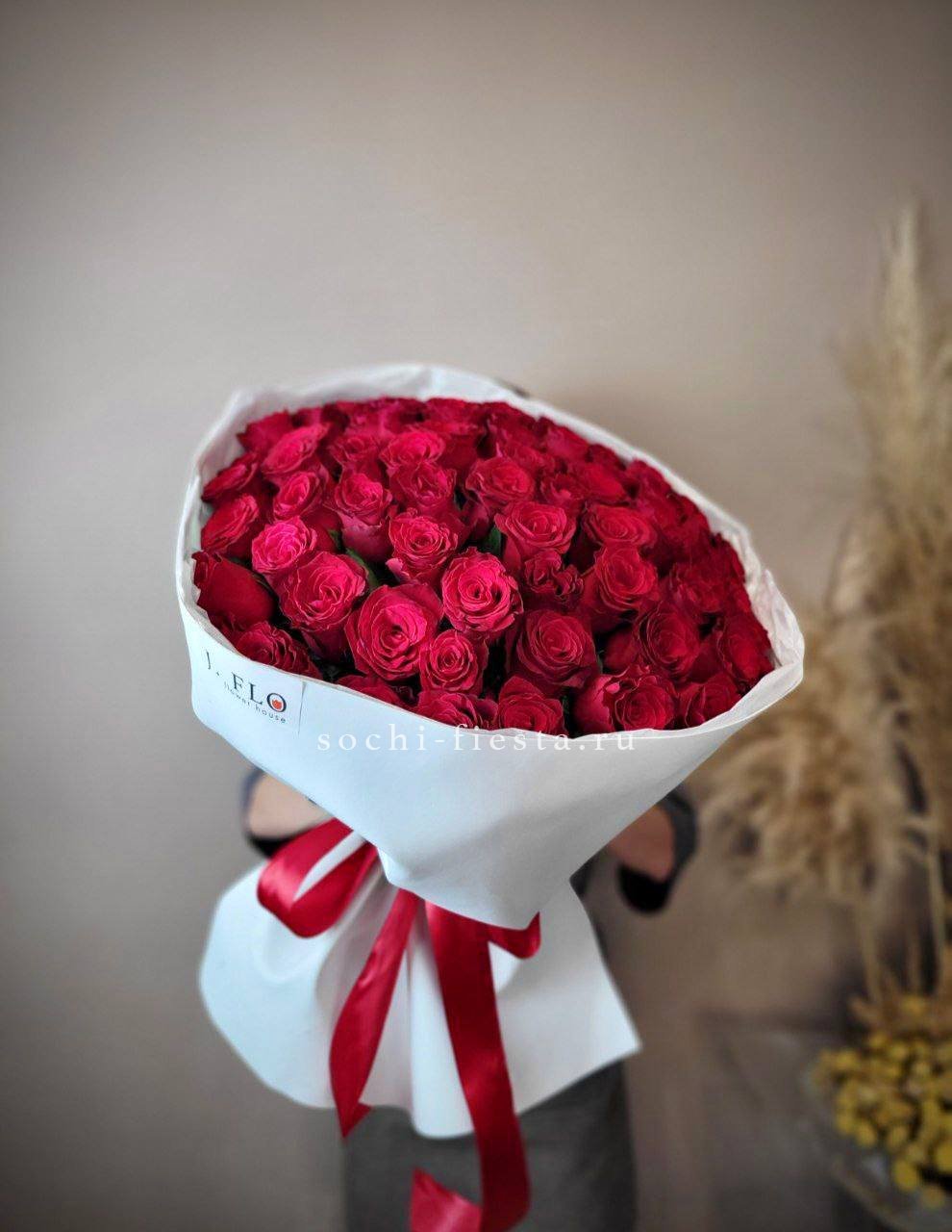 Монобукет из ста одной розы выстроен вертикальными линиями стеблей и плотной шапкой бутонов. Чистый красный цвет без примесей. Формат для по-настоящему значимых событий.