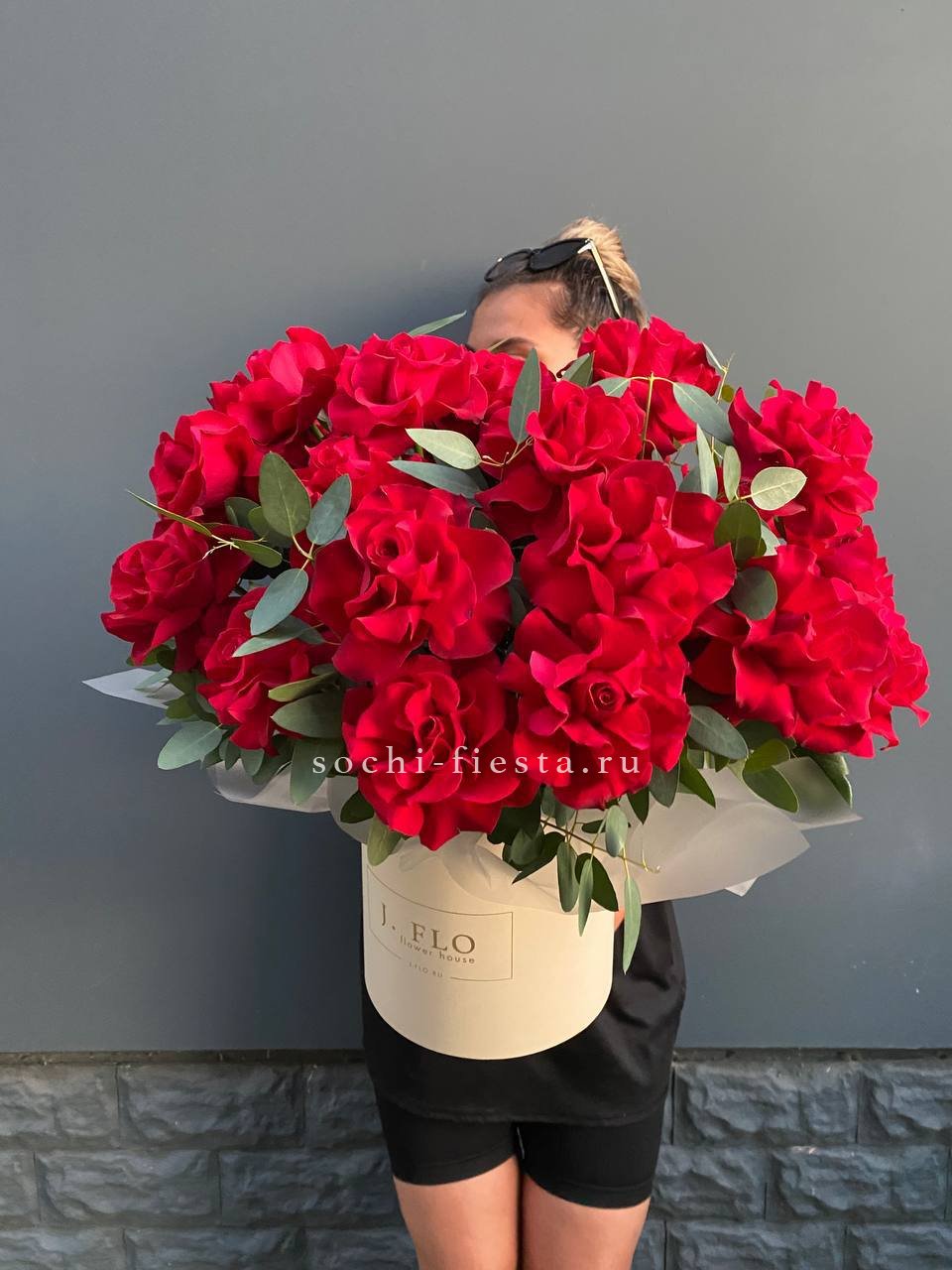 Пятнадцать роз Джумилия с характерной вывернутой формой бутонов собраны в компактный букет. Дизайнерская упаковка подчёркивает естественную красоту французского сорта.
