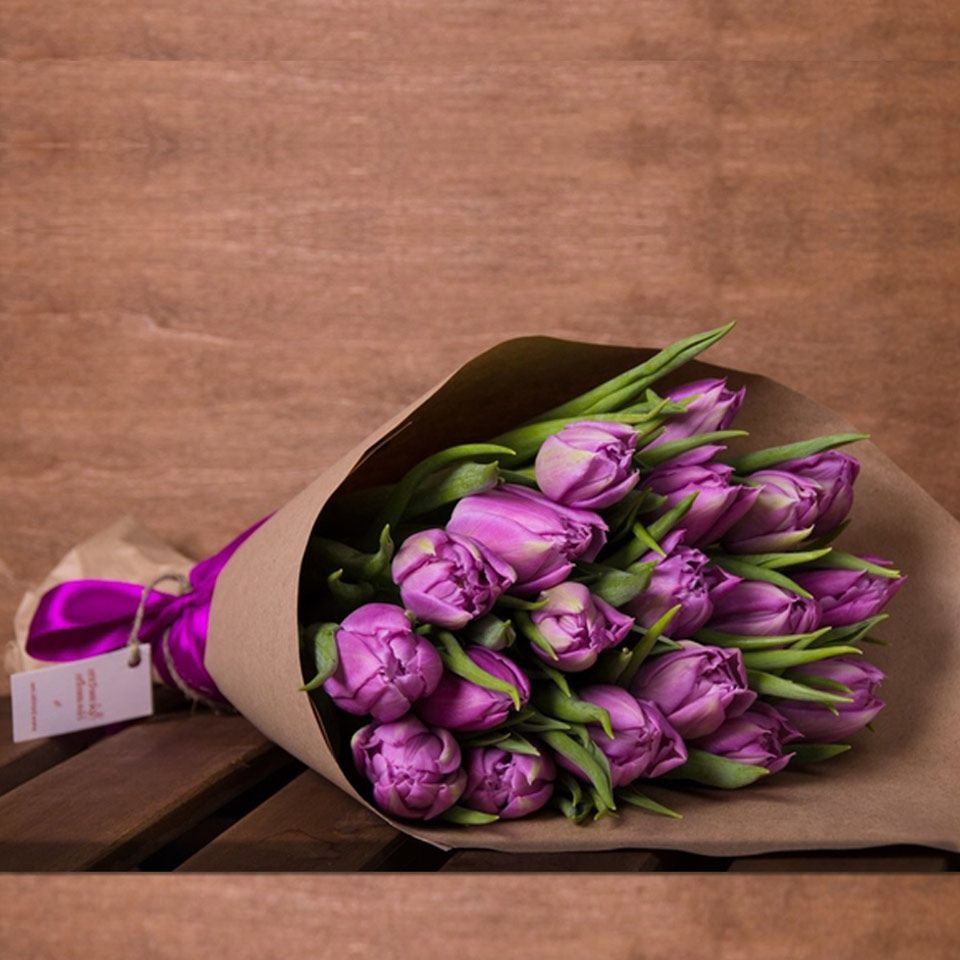 Девятнадцать тюльпанов в сиреневых тонах упакованы в светлую обёртку. Букет компактный, удобно помещается в руке и не требует сложного ухода — достаточно свежей воды каждый день.