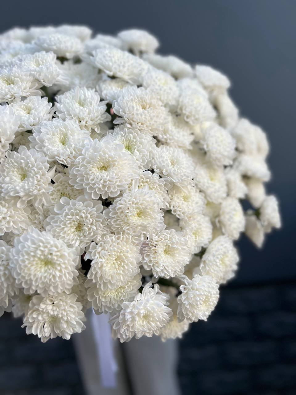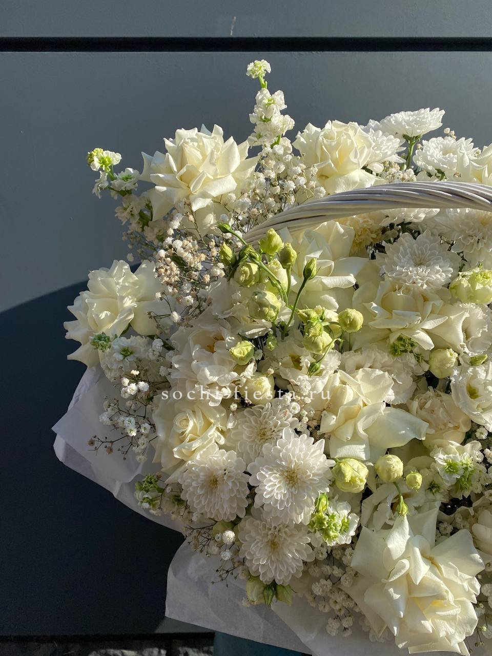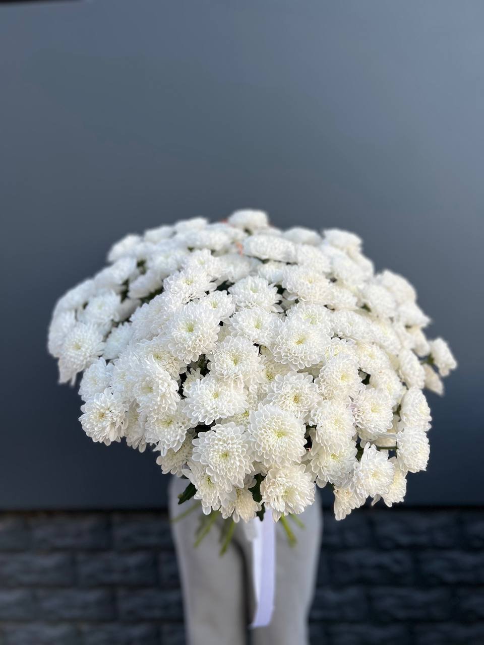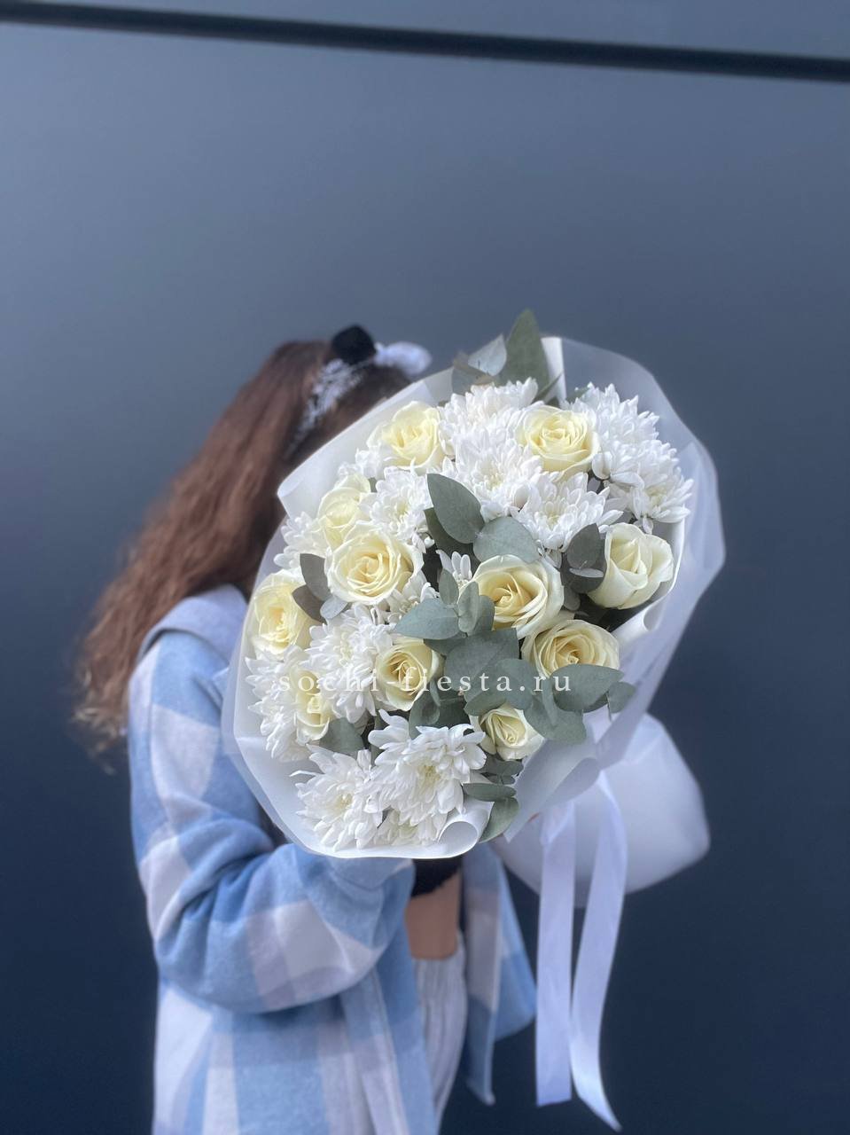 хризантема, маттиола, диантусы, розы с элементами бусин в воздушном оформлении.