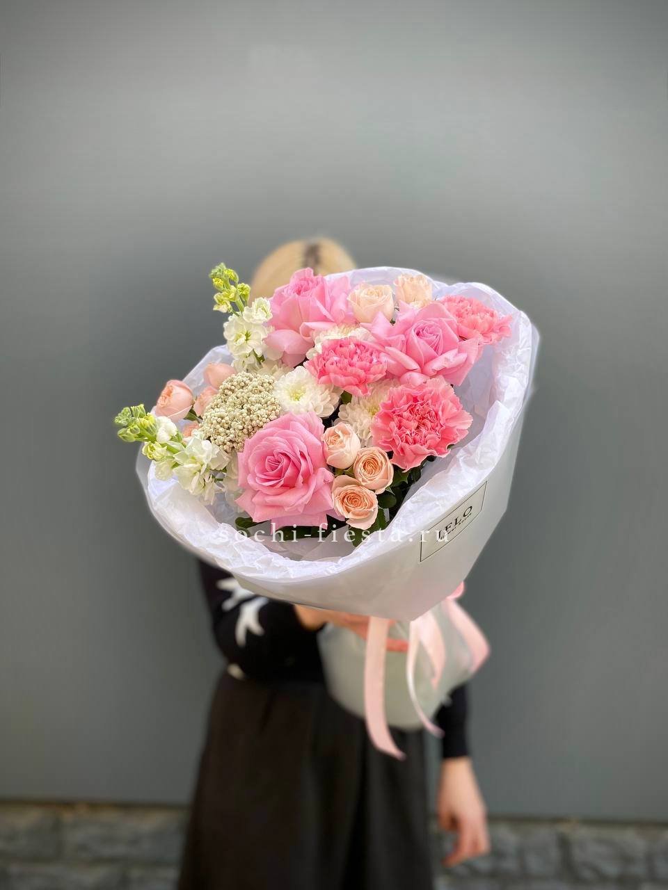 букет из нежных стойких цветов диантусов, роз, хризантем, маттиолы(возможна замена на эустому), озатамуса, бомбастика в воздушном оформлении.
