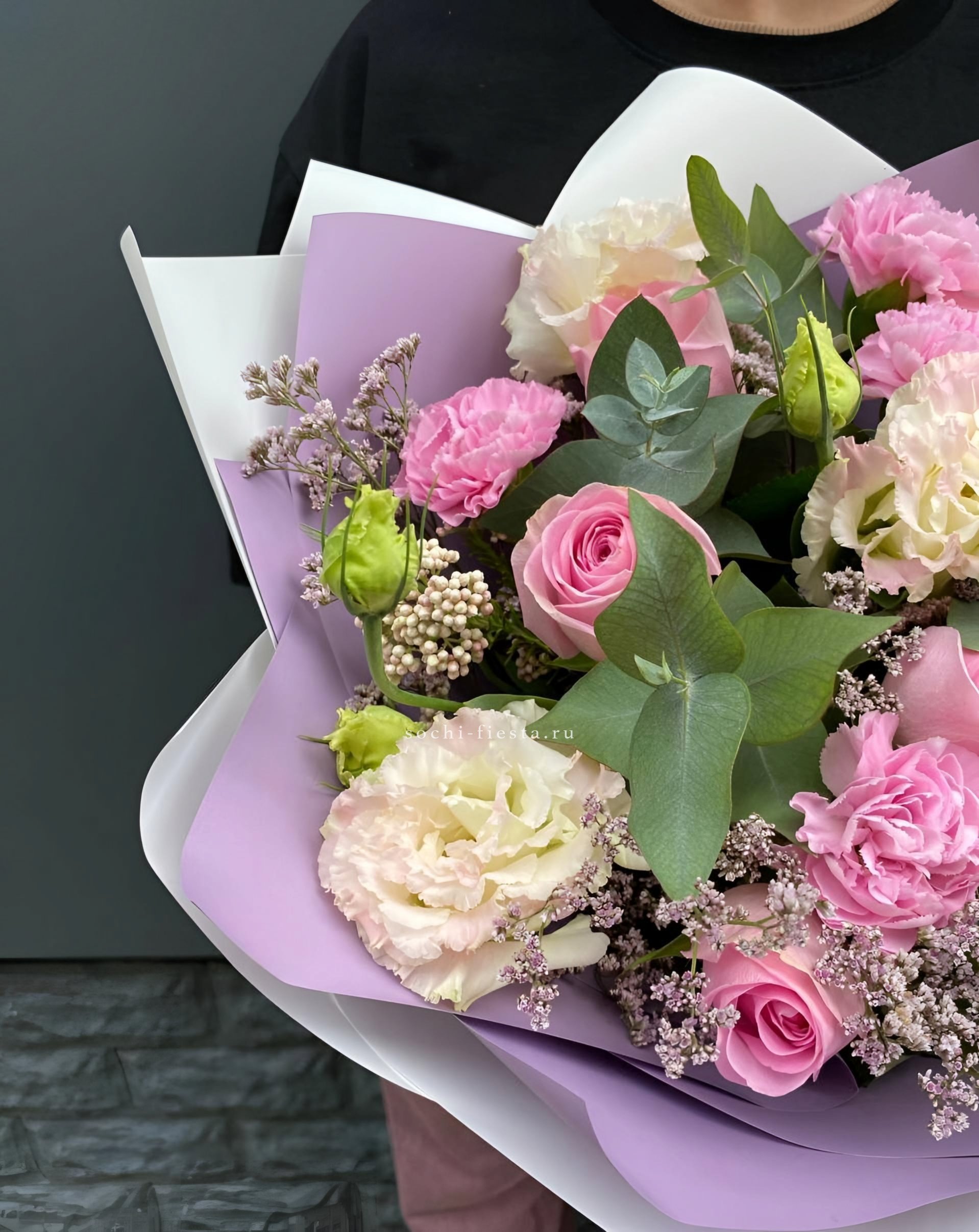 диантусы, эустома, розовые розы, лимониум(или аналог), озатамус, эвкалипт, упаковка.