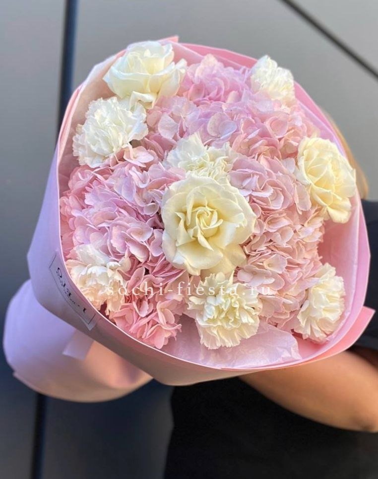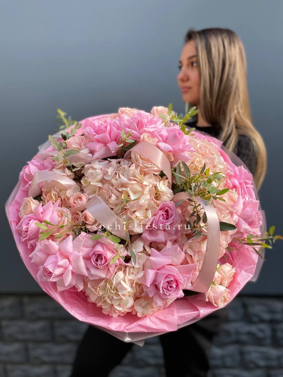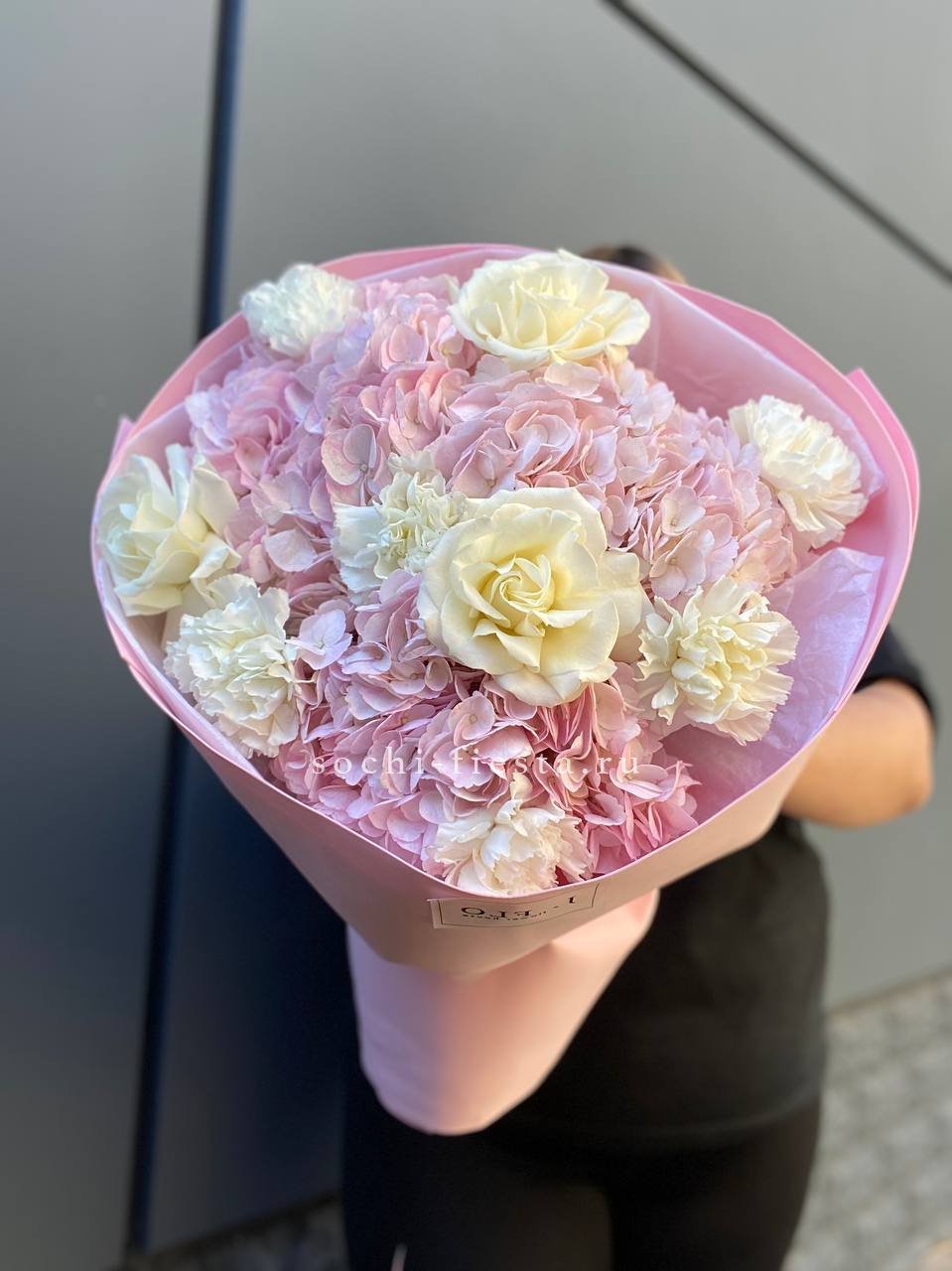 Гортензия создаёт воздушную базу, а герберы добавляют яркие точки цвета. Эвкалипт заполняет пространство между бутонами и придаёт композиции завершённость. Букет выглядит свежо и легко.
