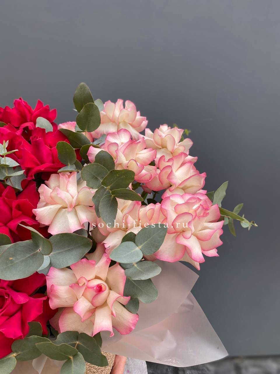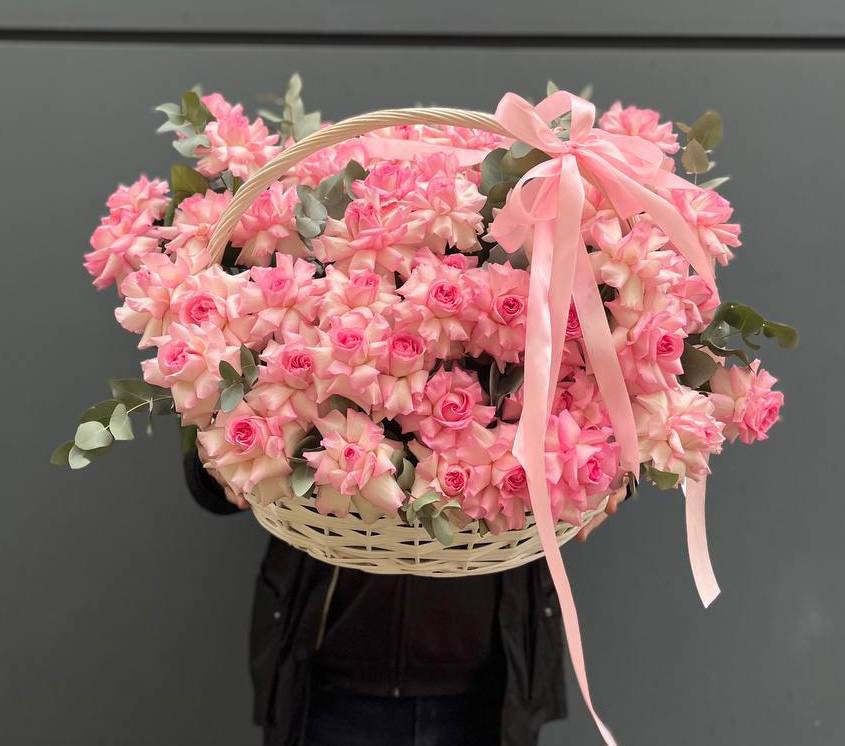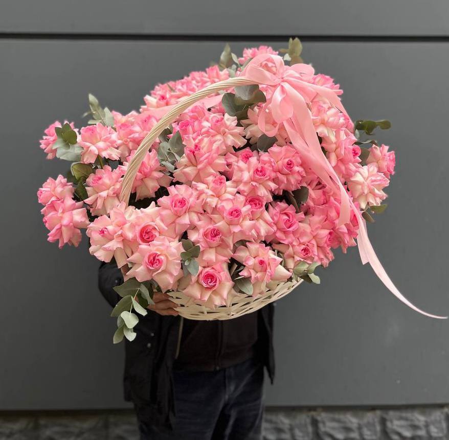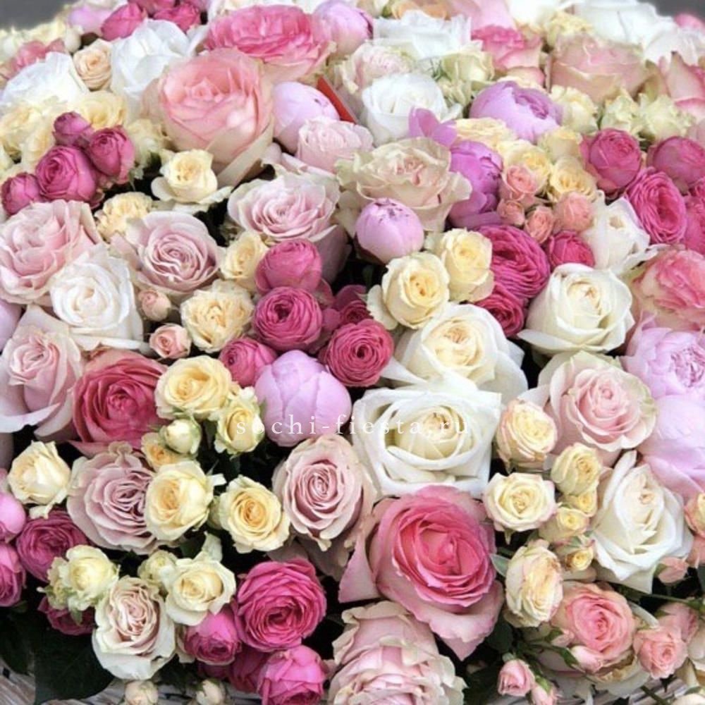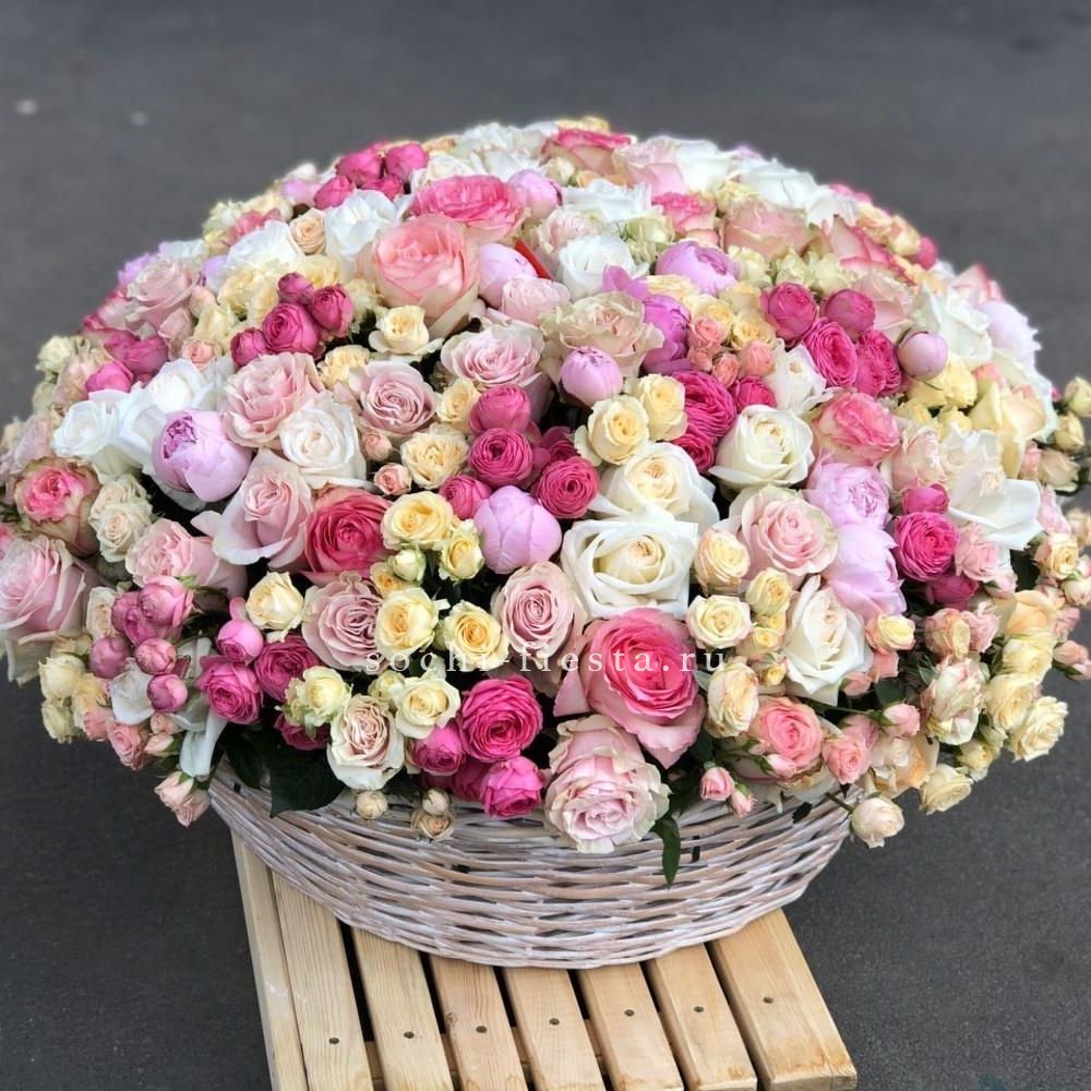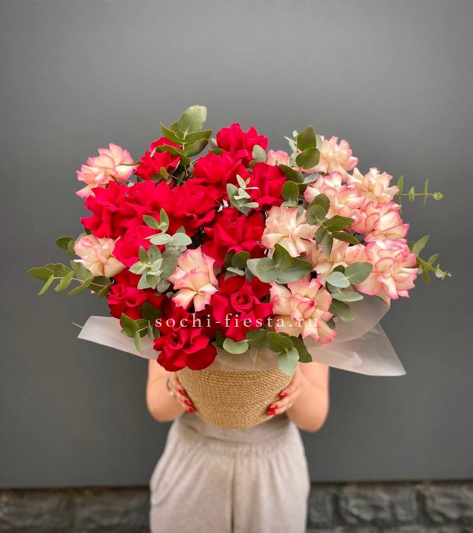 роза белого и розового оттенка 555 шт., оформление в каркас или корзину.
