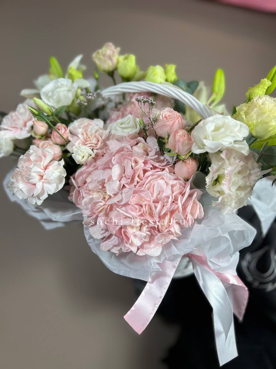 Пышная корзина с лилиями и гортензией собрана так, чтобы каждый цветок был виден и раскрыт. Розовые оттенки бомбастика перетекают в лиловый лимониум, создавая мягкую градацию. Эустома и диантус добавляют воздушности, эвкалипт завершает форму.