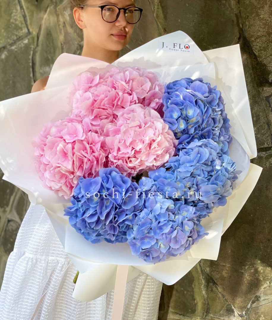 Розовые и голубые соцветия собраны в свободную композицию, где каждая гортензия сохраняет свою индивидуальность. Семь крупных головок формируют выразительный объём с естественной фактурой.