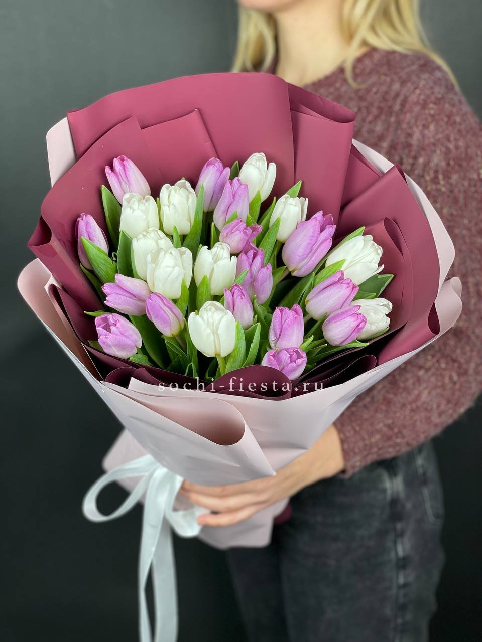 Двадцать пять разноцветных тюльпанов в комбинированном оформлении создают жизнерадостное настроение. Микс оттенков от желтого до фиолетового образует компактную композицию с яркими акцентами.