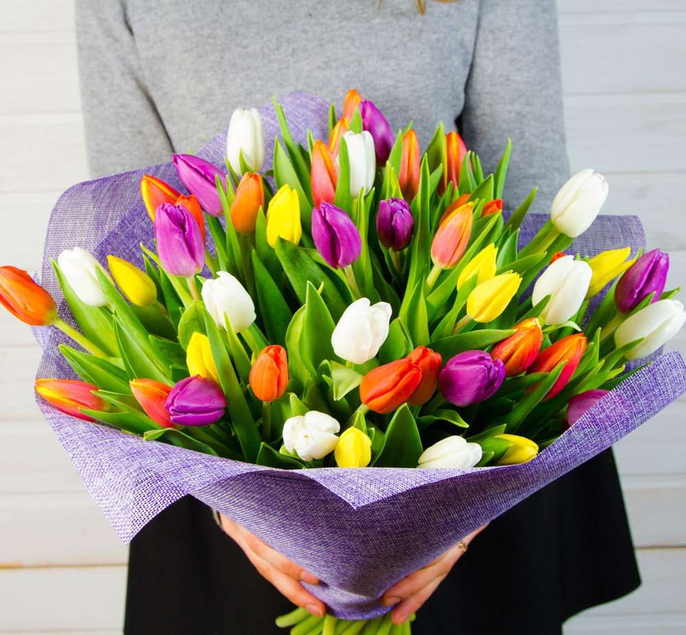 тюльпан разноцветных оттенков 51 шт., лента, оформление.