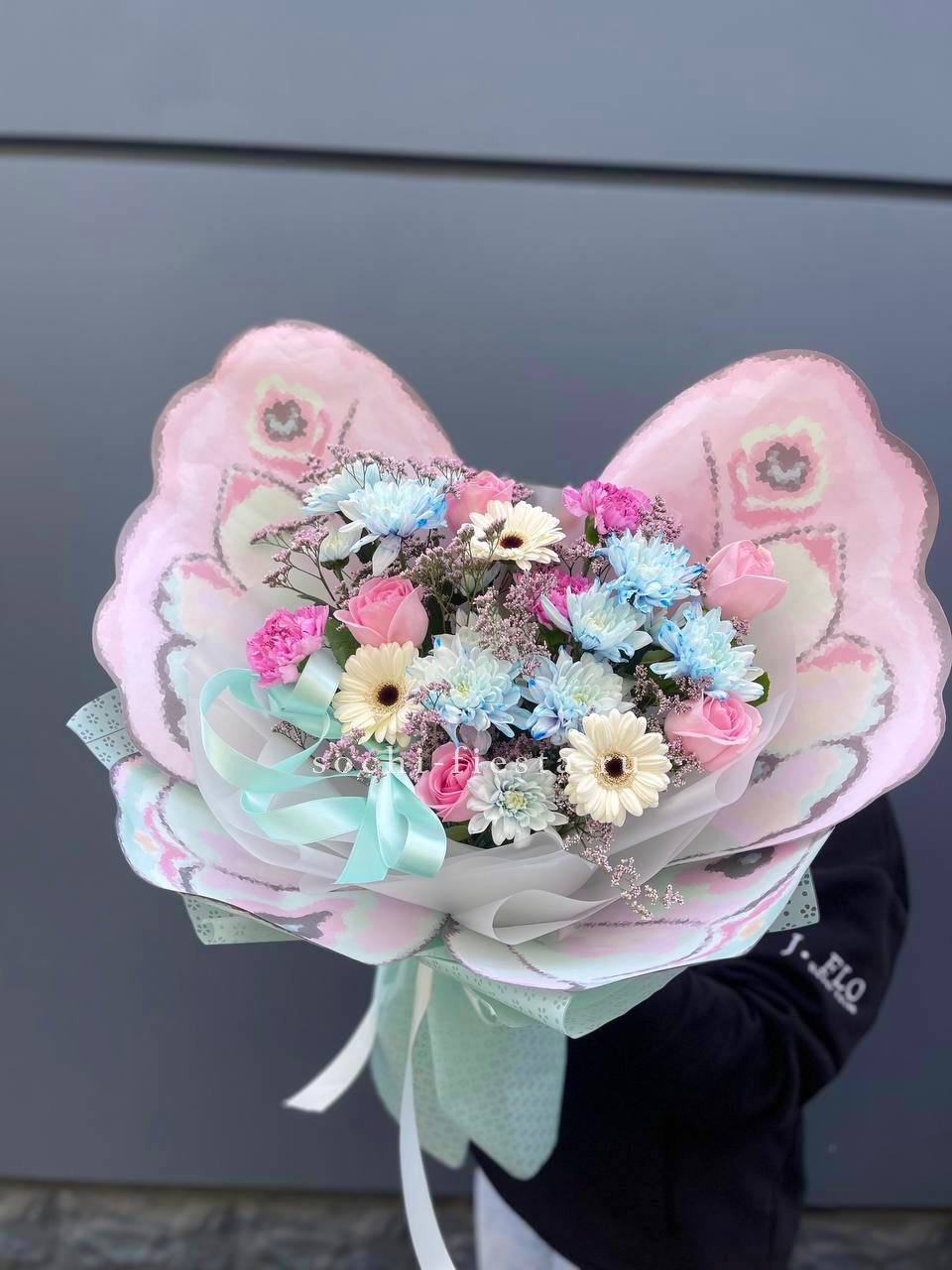 Голубые хризантемы встречаются с розовыми розами и герберами в свободной композиции. Лимониум добавляет воздушности, а декоративная бабочка завершает образ.