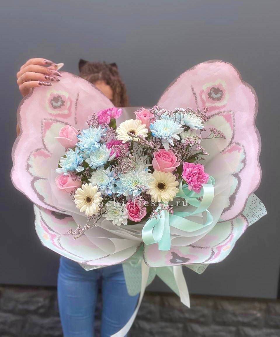 голубая хризантема, розовые розы, герберы, диантусы, лимониум, лента и дизайнерская упаковка бабочка.