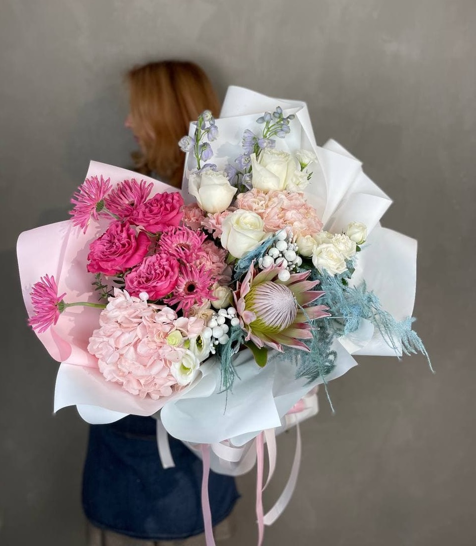 Протея с её графичными соцветиями задаёт ритм всей композиции. Амарант свисает мягкими нитями, эустома добавляет воздуха, а кустовые розы собирают форму в плотный цилиндр.
