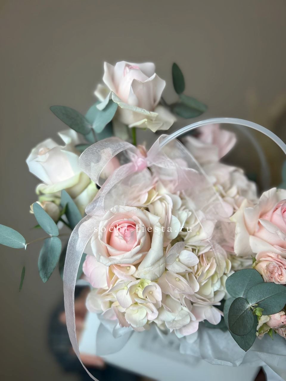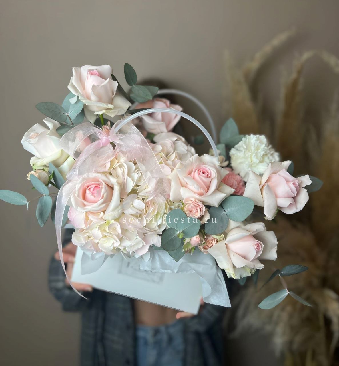 гортензия, бархатный цилиндр. По желанию заказчика, композицию можно оформить в корзину.