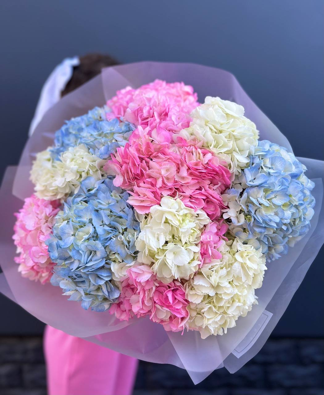 Белоснежные розы и воздушная эустома соседствуют с пышной гортензией и яркими вспышками статицы. Композиция собрана плотно, каждый цветок находит своё место в общем ритме.