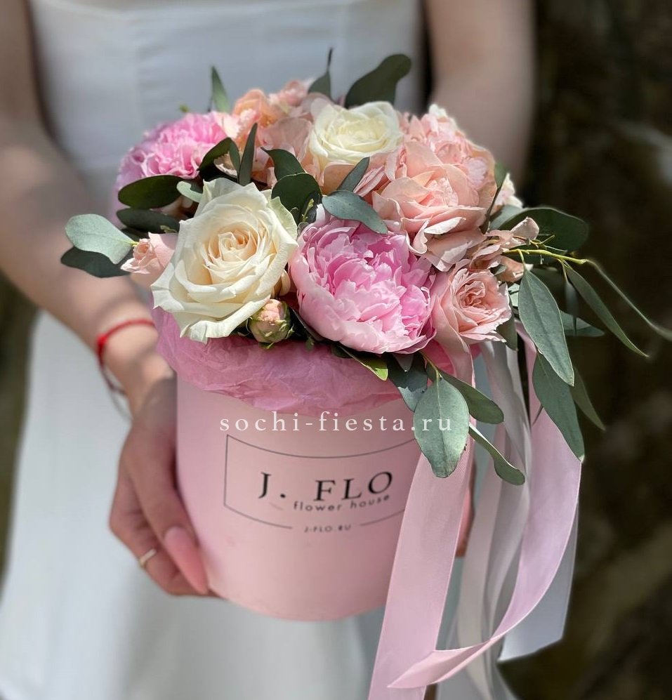 пион, розы одноголовые, гортензия, пионовидная роза, тишью, коробка D13 Цвет коробки может быть согласован с заказчиком.