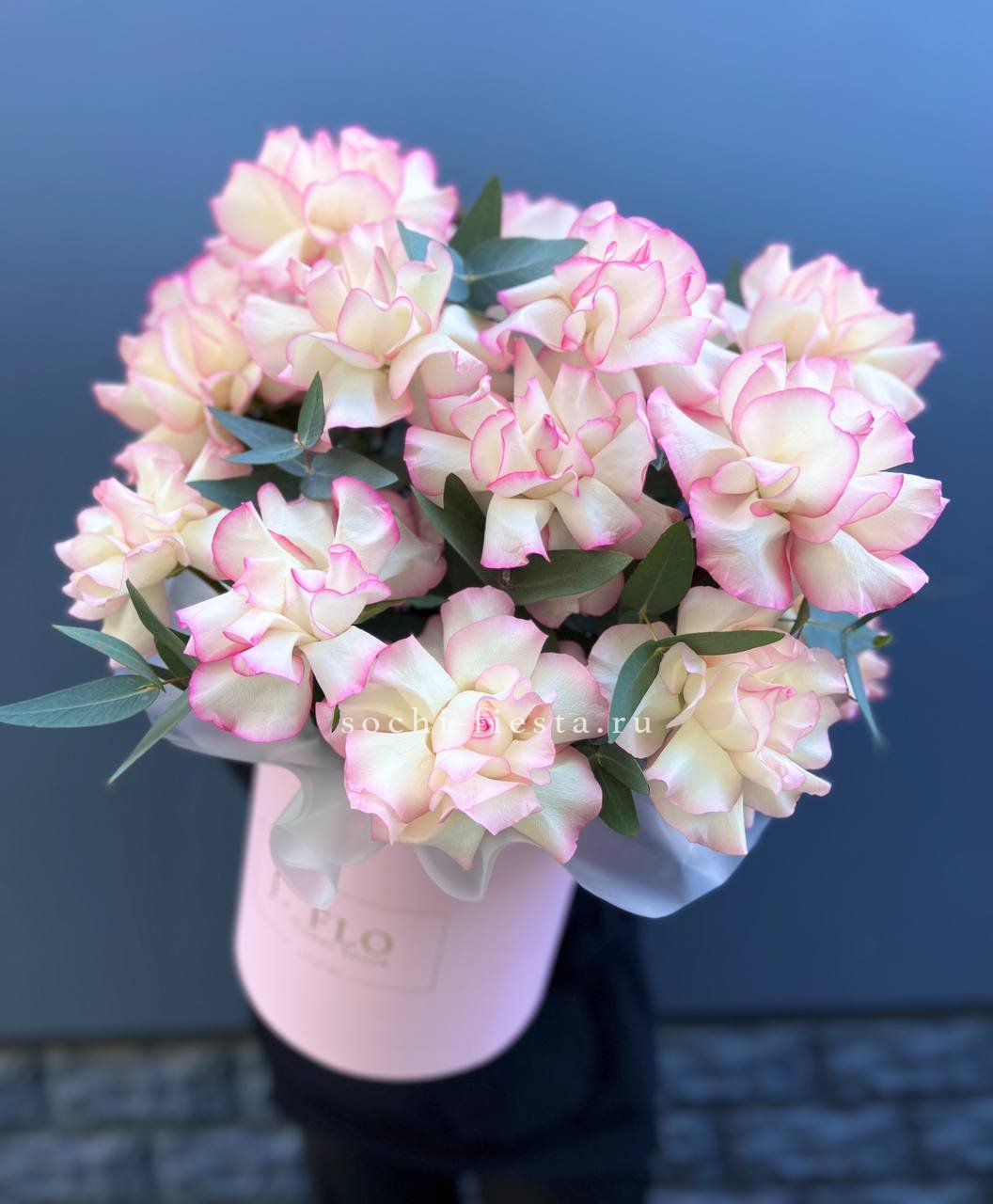 вывернутые  розы Джумилия, цилиндр D20, эвкалипт, лента, упаковка.