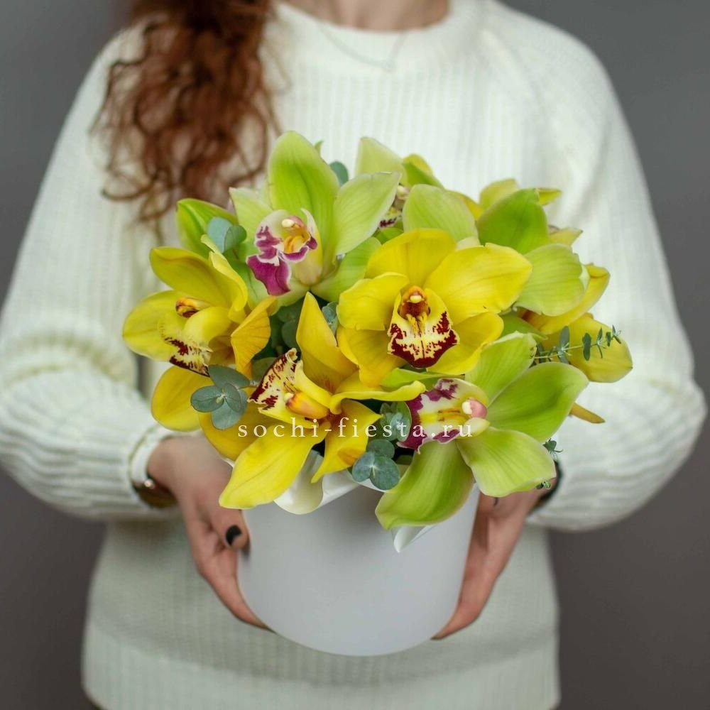 Ветка цимбидиума с крупными соцветиями размещена в круглом боксе среди декоративной зелени. Композиция выглядит графично и держит форму благодаря плотной укладке.