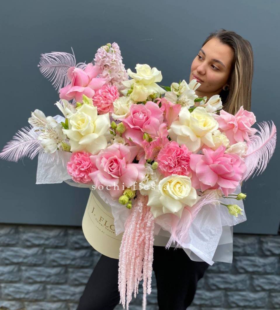 Французские розы и маттиола задают романтичный тон, а амарантус спускается мягкими каскадами за пределы бокса. Перья вносят графичную легкость в общую картину.
