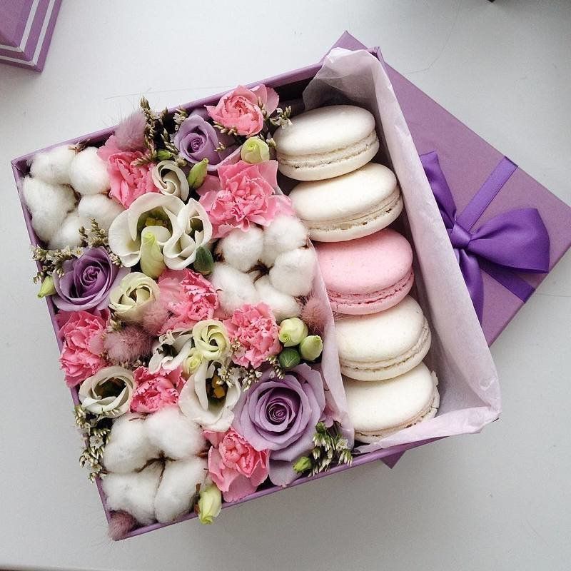 комбинация из цветочных элементов нежных оттенков, 6 макаронс, круглая коробка светлого оттенка.