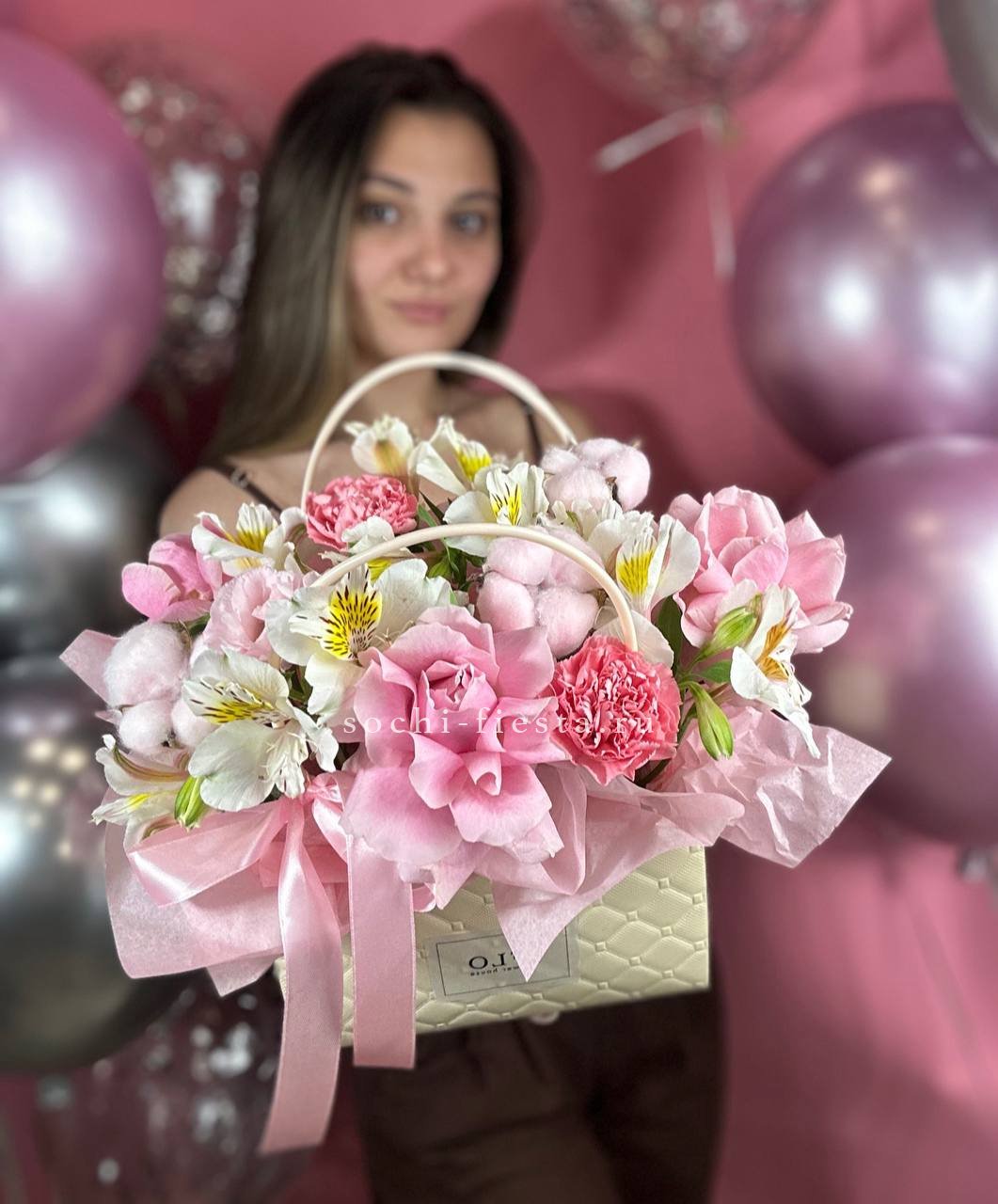 Герберы и альстромерии собраны в яркую компактную композицию. Диантусы заполняют пространство между соцветиями и создают лёгкую дымку. Удобный формат в сумке-кашпо для размещения на столе или полке.