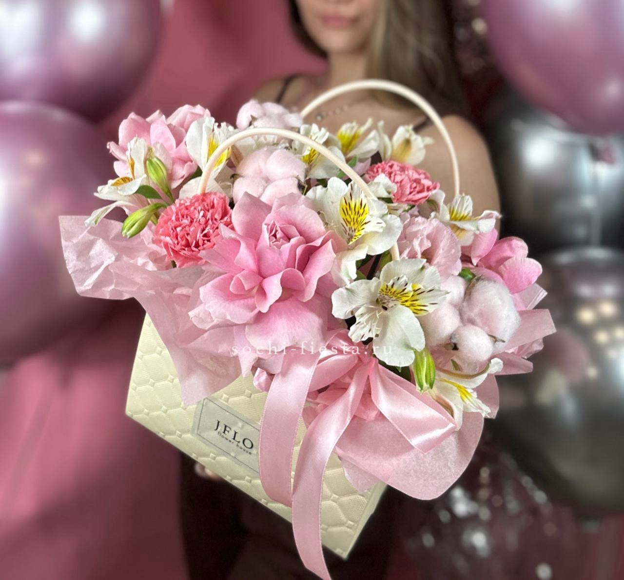 герберы, диантусы, альстромерии,  лента, эвкалипт,  сумка-кашпо.