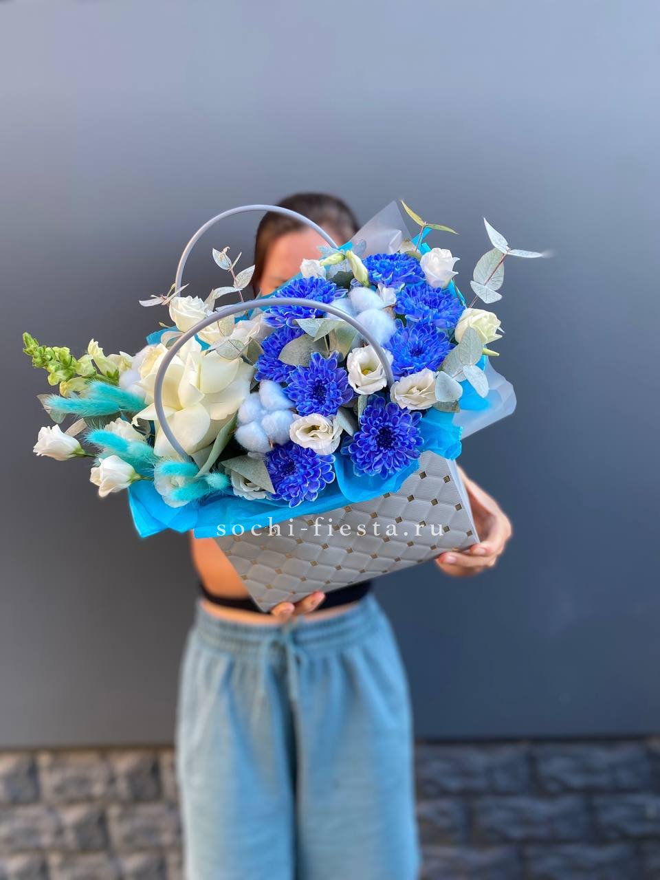 пионовидные кустовые розы, альстромерии, сумочка, лента.