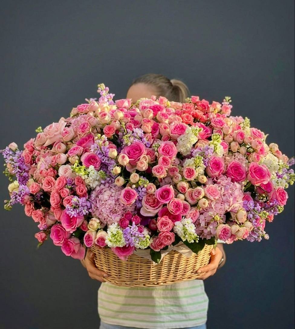 цветочная корзина с розами, мисти баблс, диантусами и гортензией.