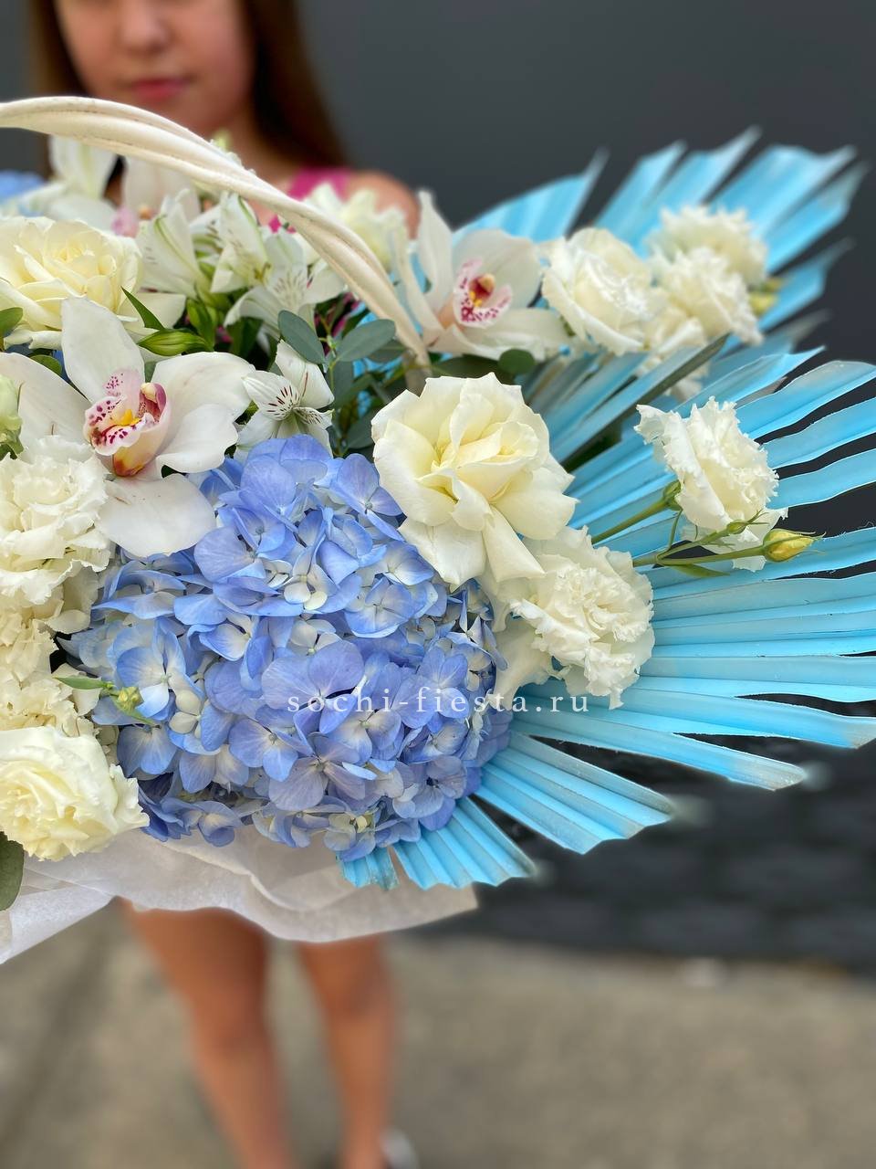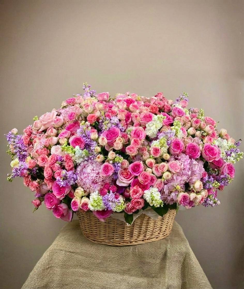 Эта роскошная интерьерная корзина — настоящее воплощение цветущего сада, наполненного нежностью и свежестью. Она выглядит невероятно объемной и фактурной благодаря гармоничному сочетанию классических и экзотических цветов.