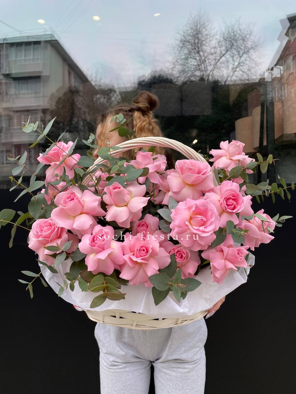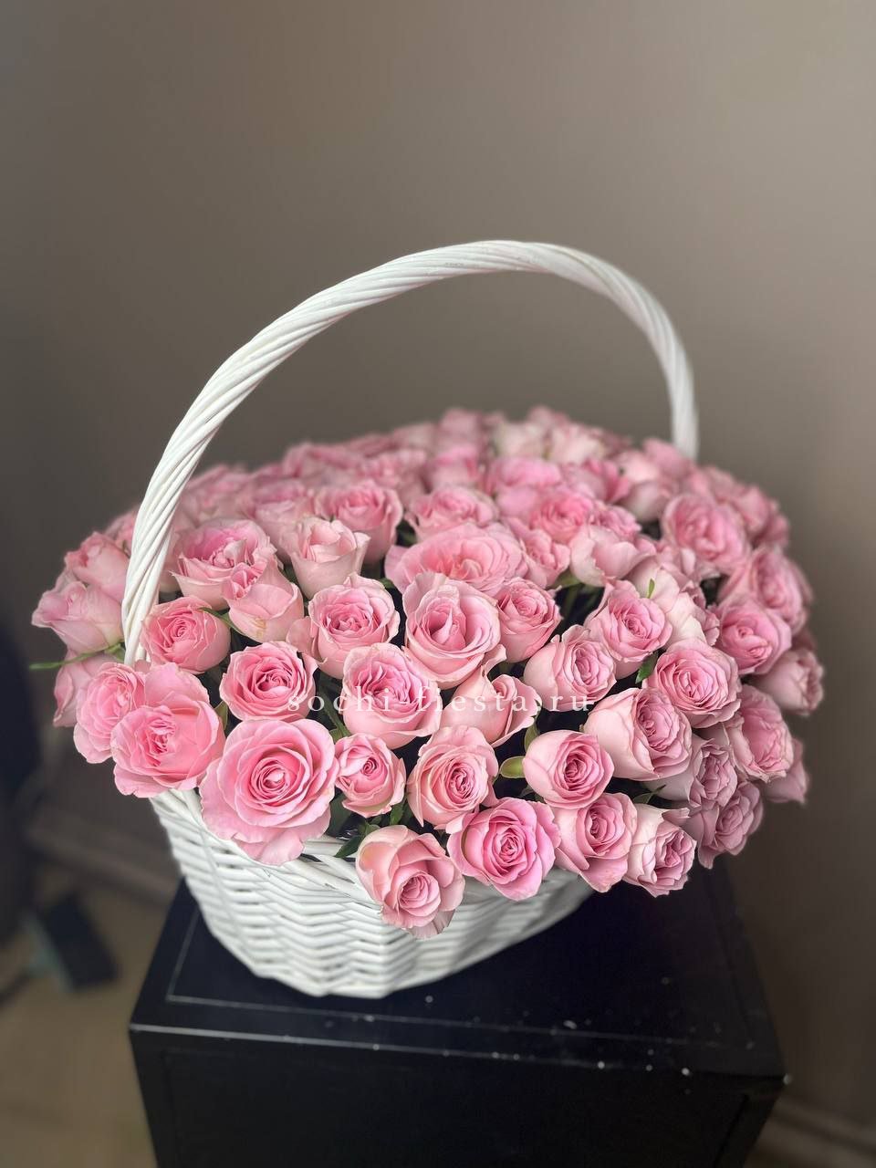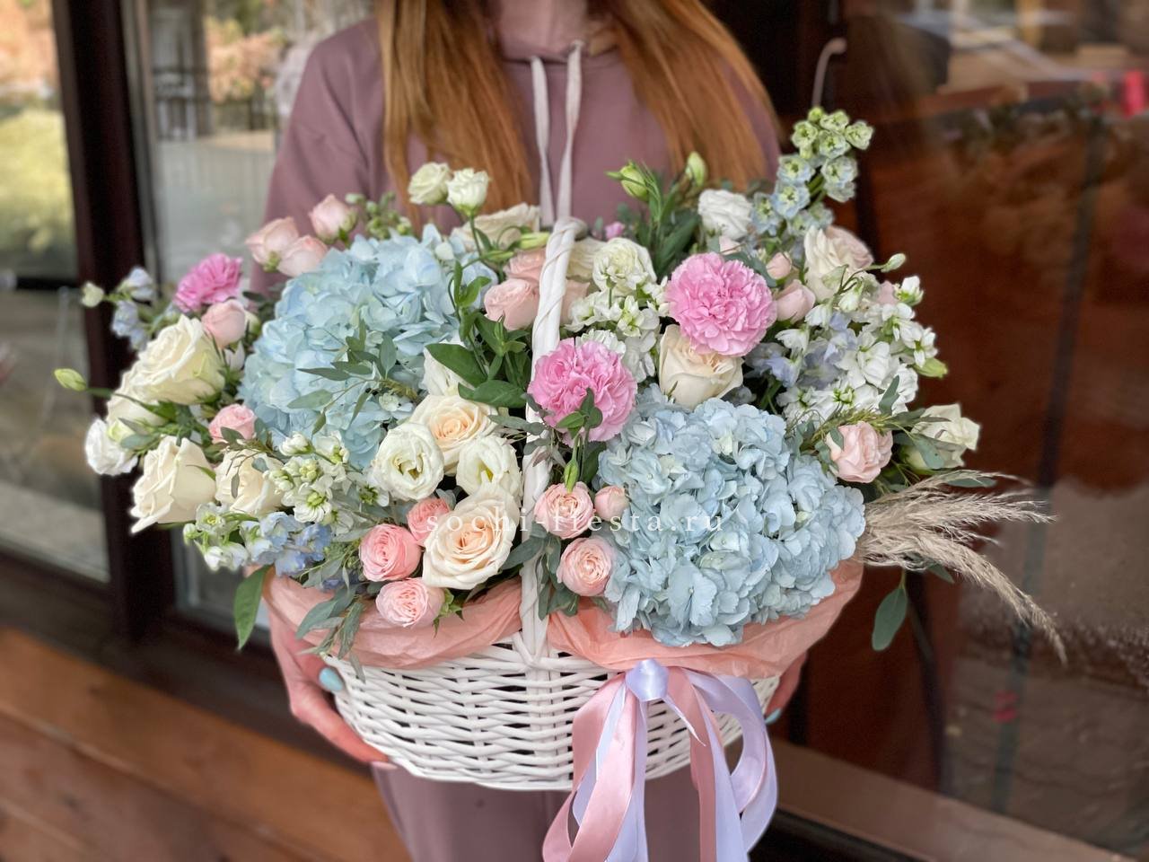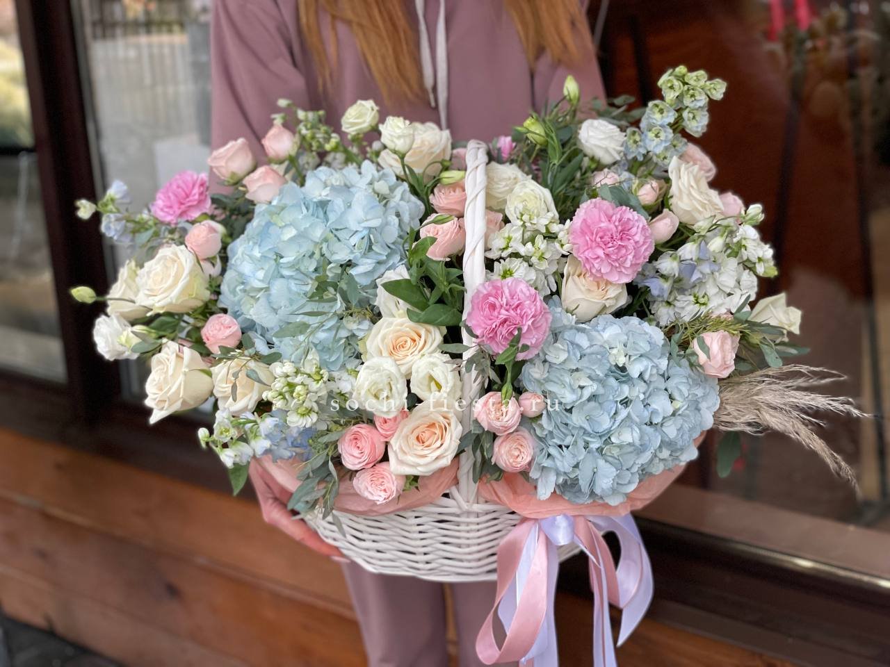 Белые розы и эустома образуют воздушную композицию с мягкими переходами между соцветиями. Хризантемы и маттиола добавляют объема, а гипсофила создает легкую дымку по краям. Корзина выглядит свежо и собранно в любом пространстве.