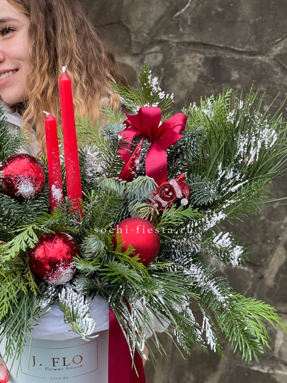 живая ель (датский нобилис), новогодние игрушки, свечи, декор, оазис, бокс D16см, ленты, тишью Готовая композиция может иметь незначительные внешние отличия от примера на фотографии.