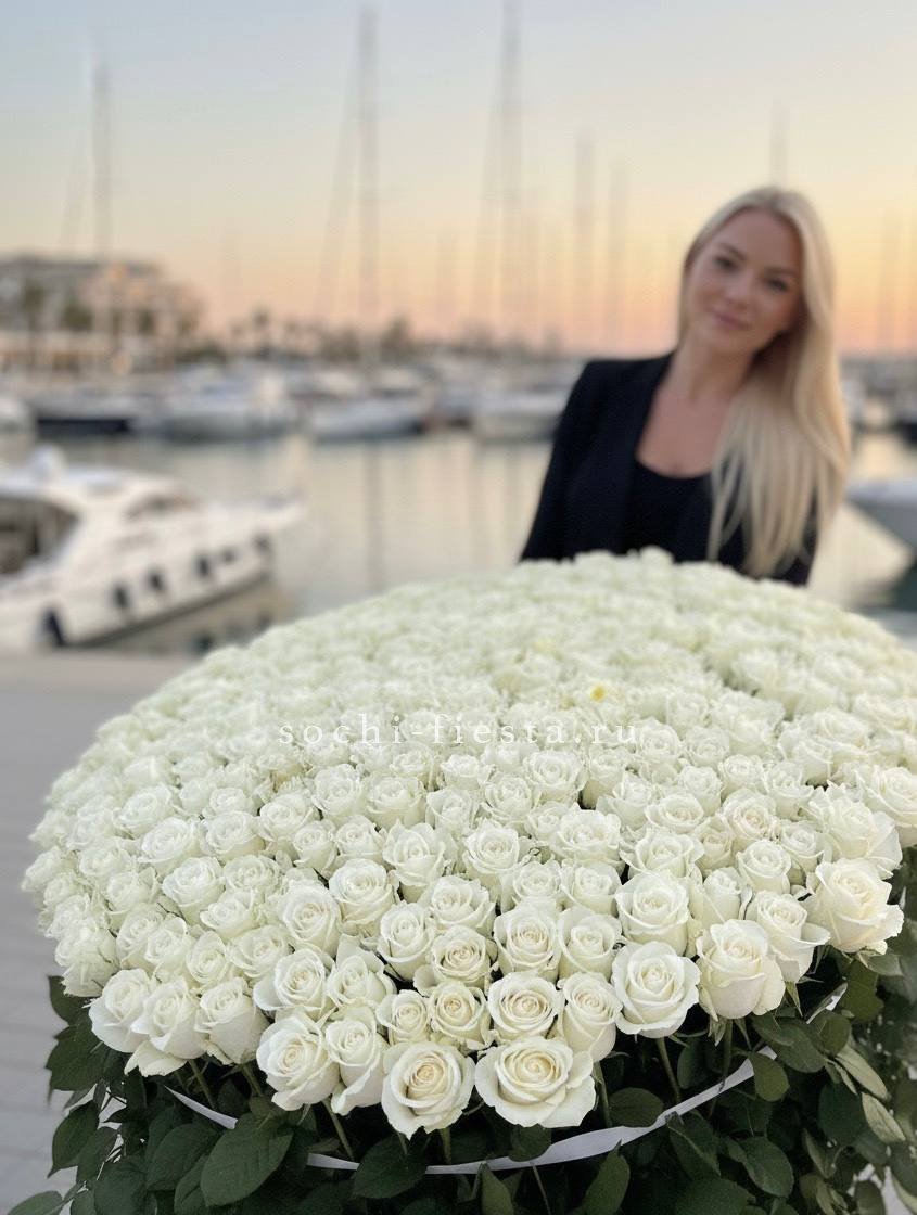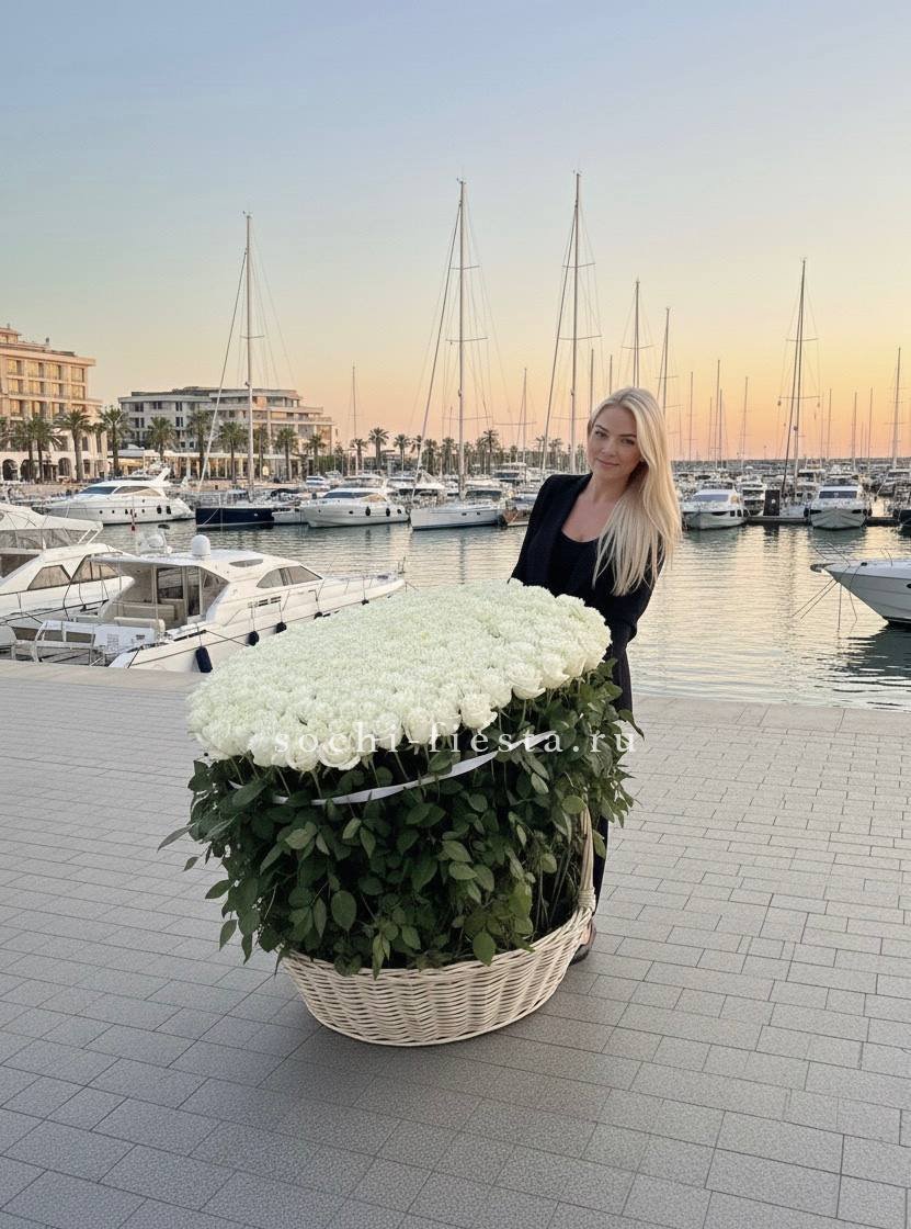 Пятьсот одна роза образует форму сердца из белых и красных бутонов. Плотная композиция в корзине удерживает симметрию и объём без дополнительных конструкций. Готовое решение для выражения чувств в масштабной форме.
