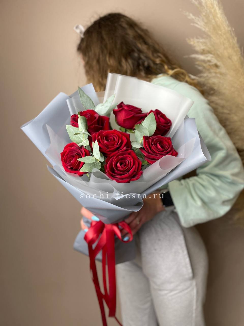 Переход от белого к розовому создаёт мягкую игру тонов. Эвкалипт добавляет фактурности и свежести зелени. Одиннадцать роз складываются в гармоничную композицию с лёгким характером.