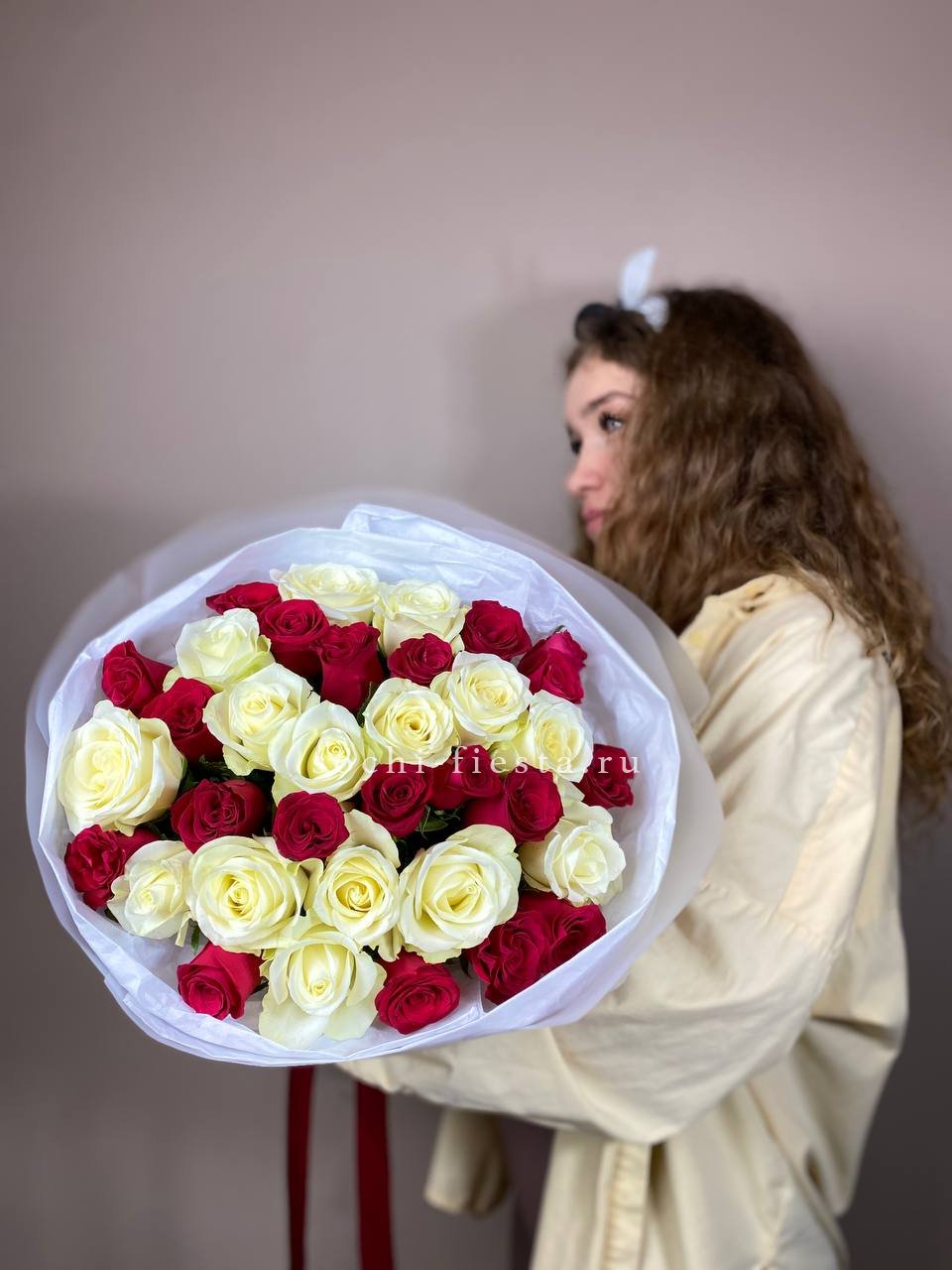 Для заказа товара "Букет из красных белых 35 роз" с доставкой в Уфе нажмите в корзину