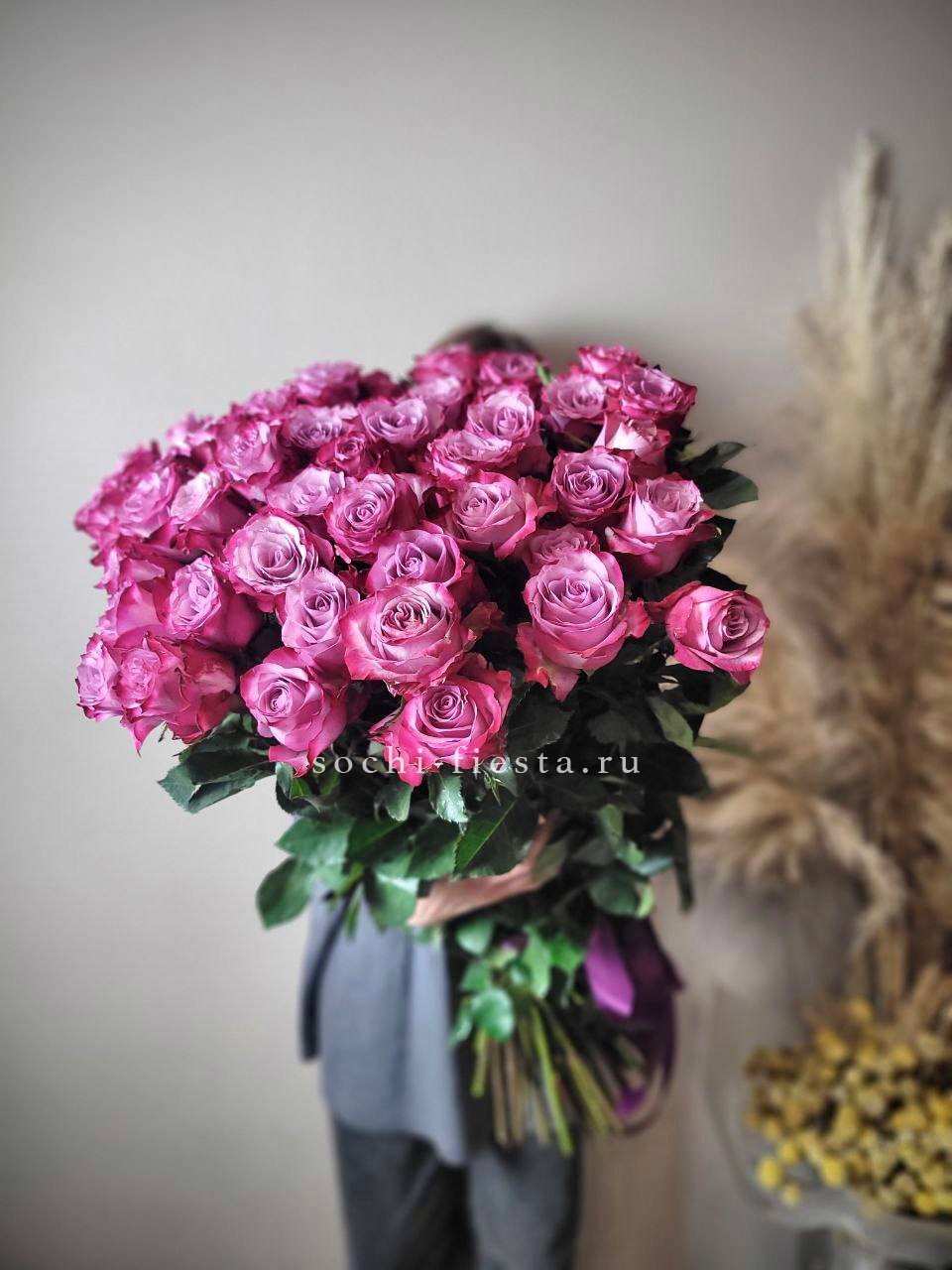 Глубокий фиолетовый оттенок роз Deep Purple создает почти графичное впечатление. Высокие стебли собраны в свободную охапку, где каждый бутон читается отдельно и при этом держит общий ритм.
