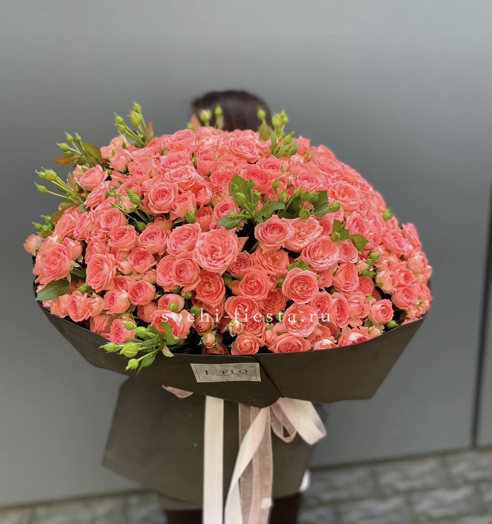 Сто одна кустовая роза Барбадос создаёт впечатляющий объём и визуальную мощь. Множество бутонов формируют плотную структуру с выразительным силуэтом. Композиция наполняет пространство и приковывает взгляд.