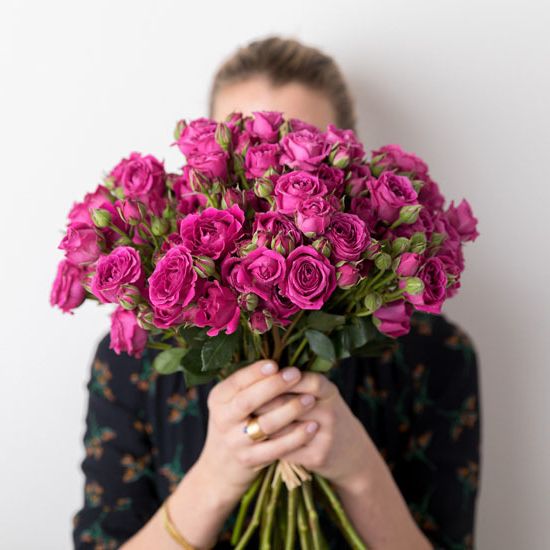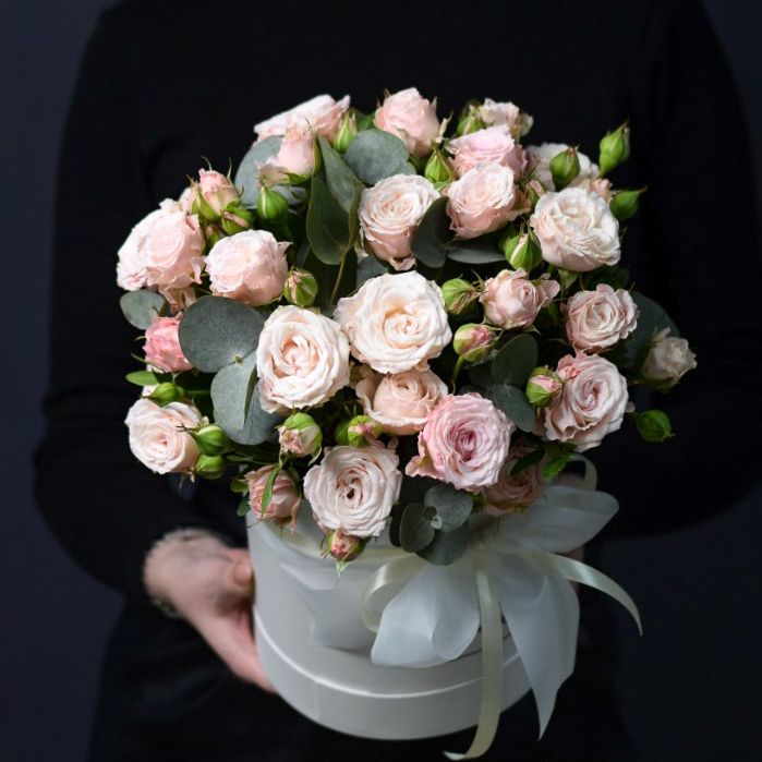 Пятнадцать кустовых роз собраны в плотную округлую форму. Мелкие бутоны создают воздушную текстуру и мягкий объём в пространстве.