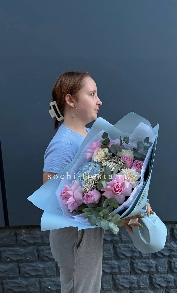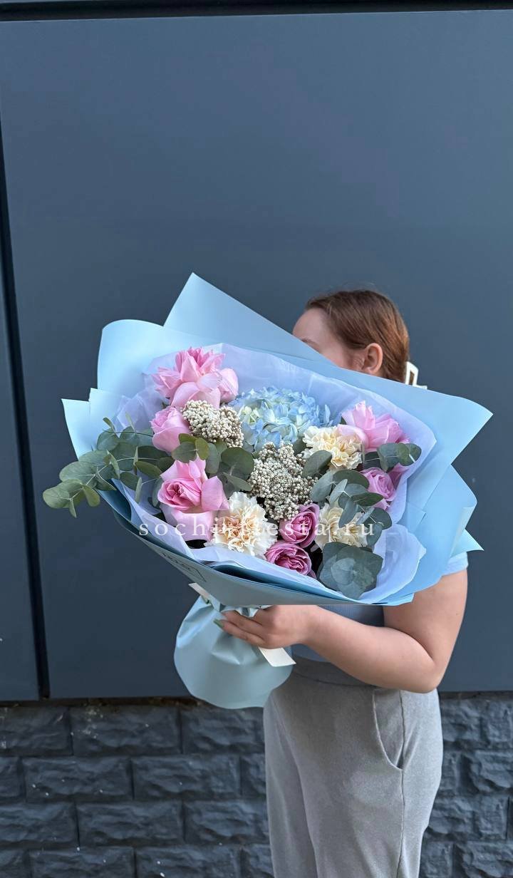 Плотная сборка с пышными соцветиями гортензии и яркими герберами создает объемный силуэт. Маттиола и лимониум добавляют воздушности по краям, а диантусы заполняют центр мягкими переходами.