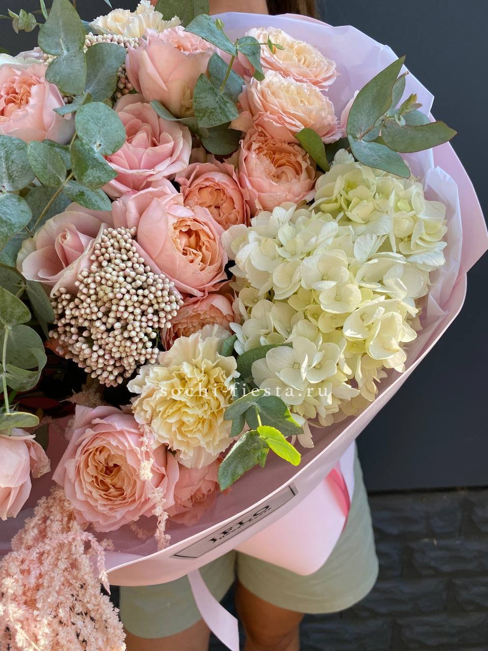 джульетта, озатамус, диантус, гортензия, розовая роза, амарант, оформление.