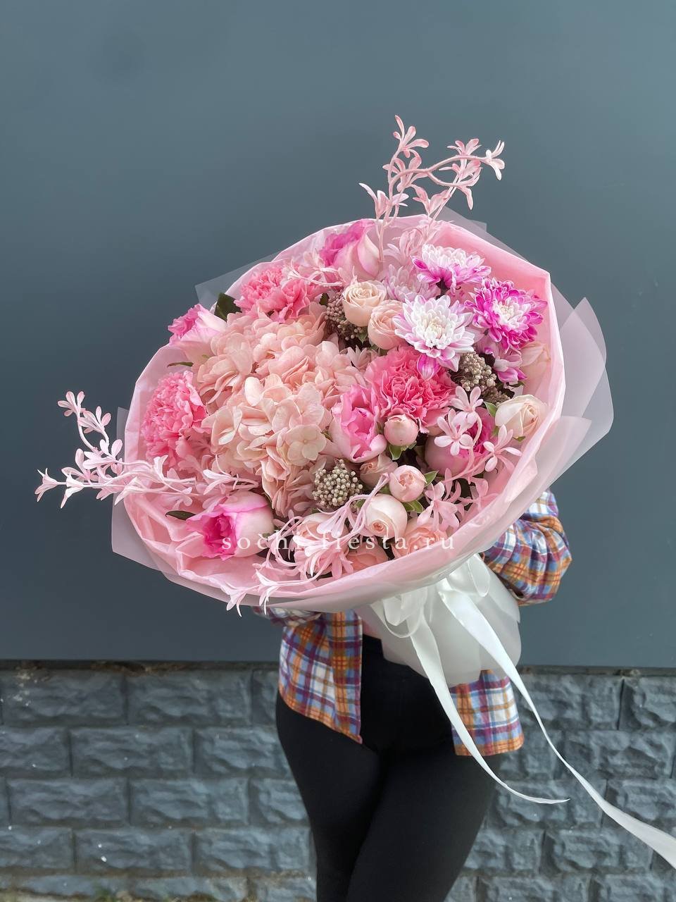 гортензия, диантус, хризантема, озотамус, розовые розы, оформление.