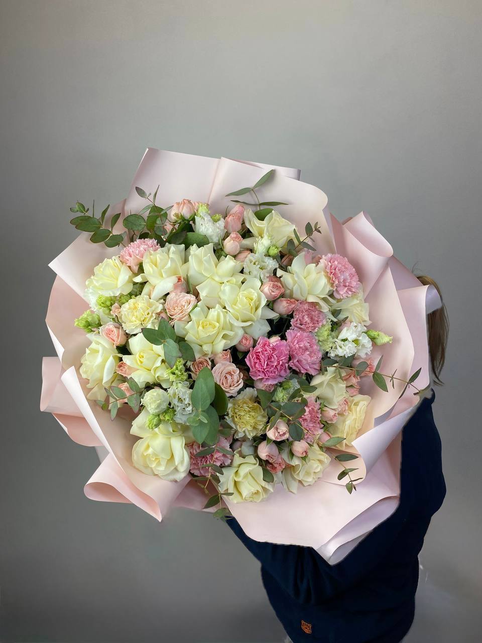 диантус, бомбастик, белые розы, эвкалипт, эустома, упаковка.