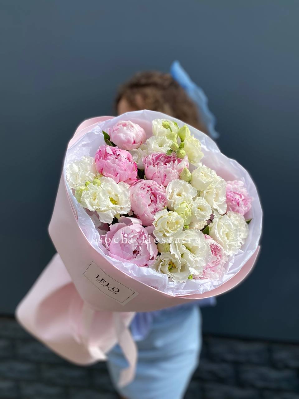 Пионы и эустома собраны в плотную округлую форму с выразительной текстурой лепестков. Белые и розовые оттенки создают мягкий переход без резких границ.