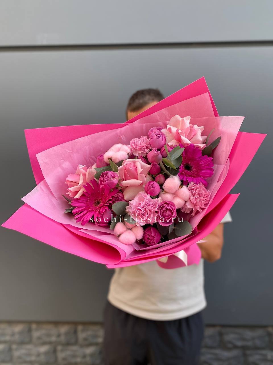 Герберы и розы собраны в плотный микс насыщенных оттенков. Хлопок добавляет мягкости, диантус разбивает ритм яркими вспышками.