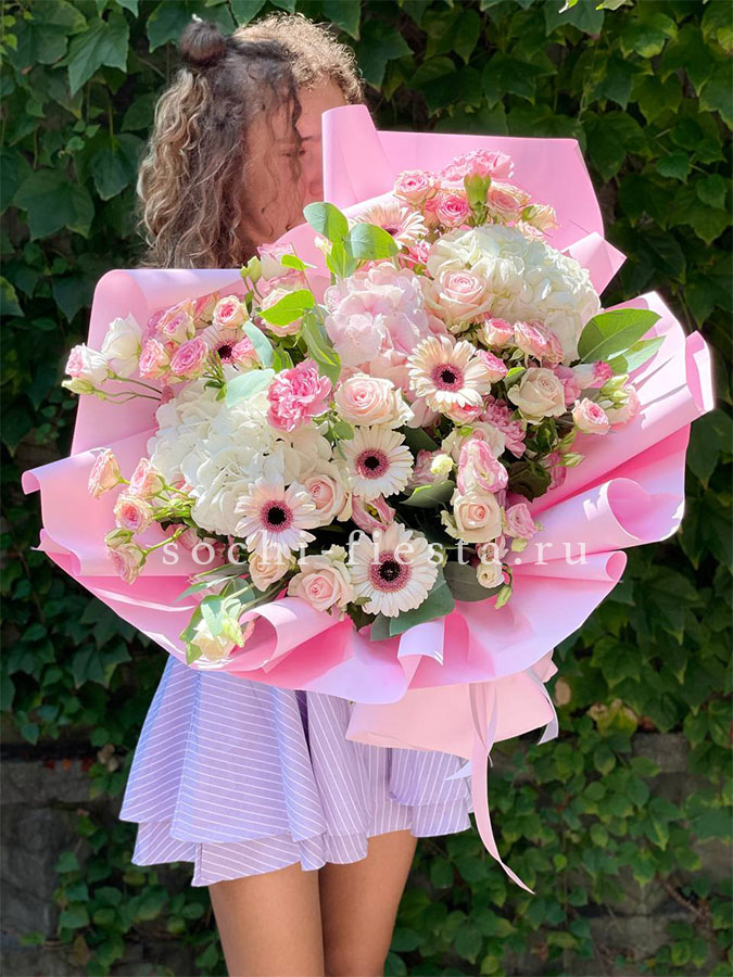 диантус, гербера, кустовая роза, роза белая, лимониум (замена в несезон), дельфиниум/маттиола/львиный зев/гладиолус (замена в несезон), лента, авторская упаковка.