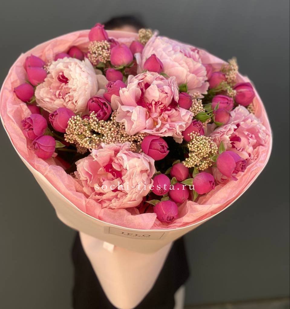 пионы, кустовые розы, озатамус , лента и дизайнерская пленка.