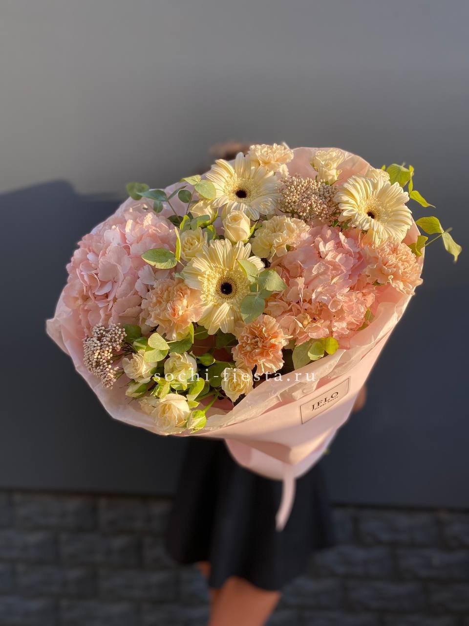 гербера, диантус, гортензия, бомбамстик, озатамус в нежном оформлении.