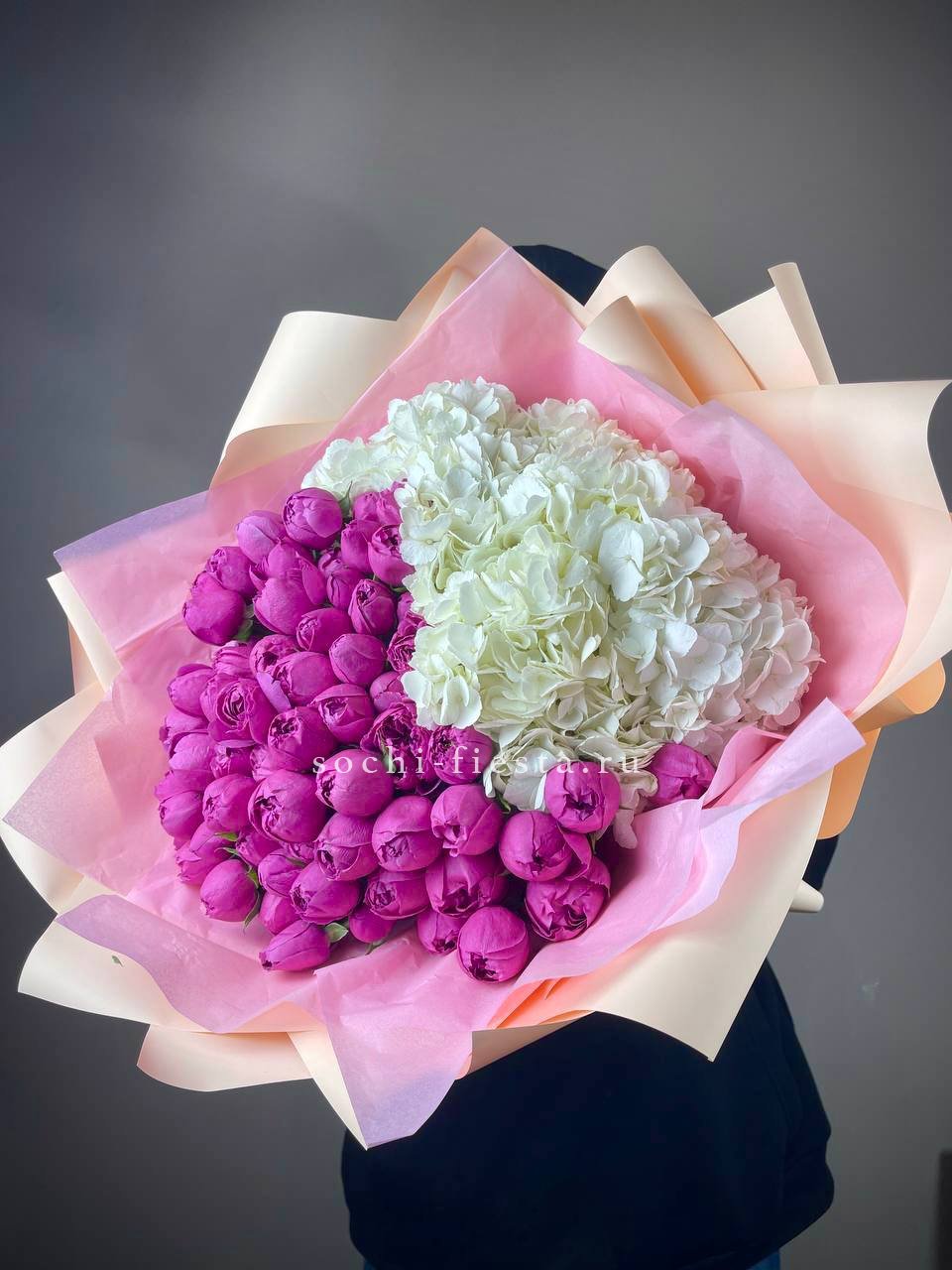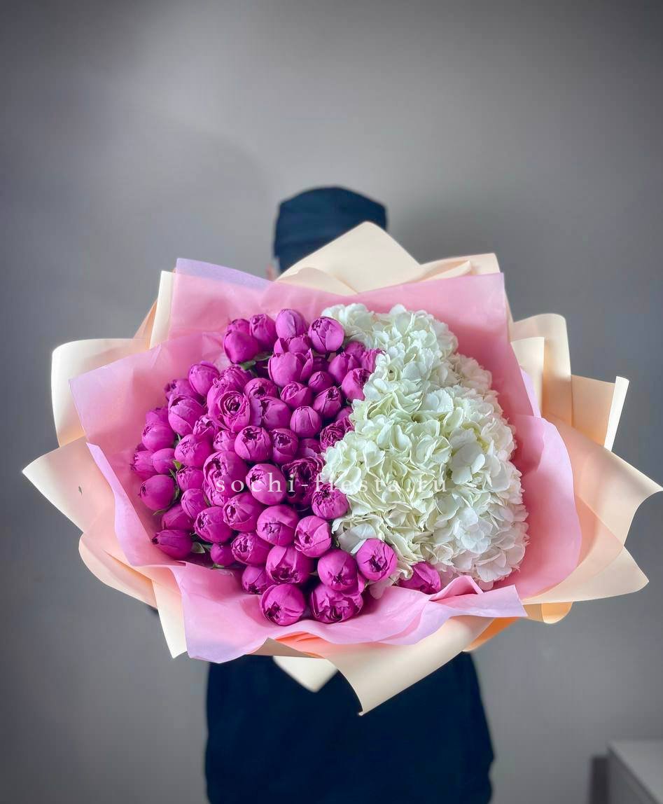 гортензия, розовые розы, кустовые розы, маттиолы,, лимониум лента и дизайнерская пленка.
