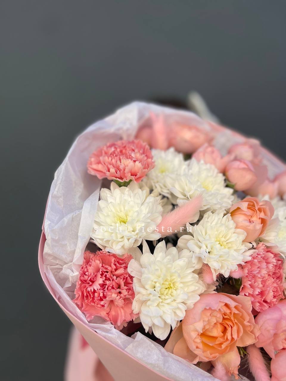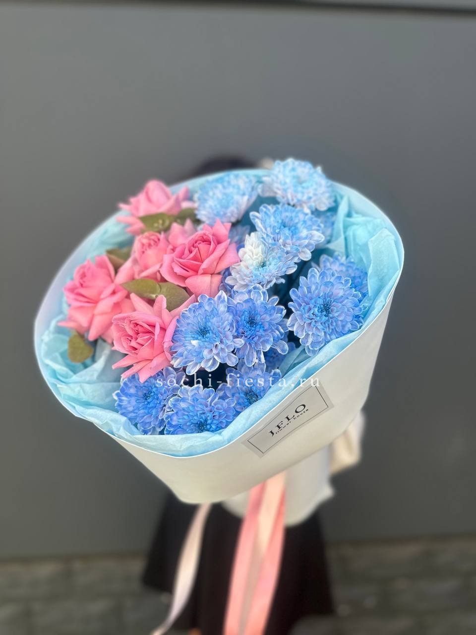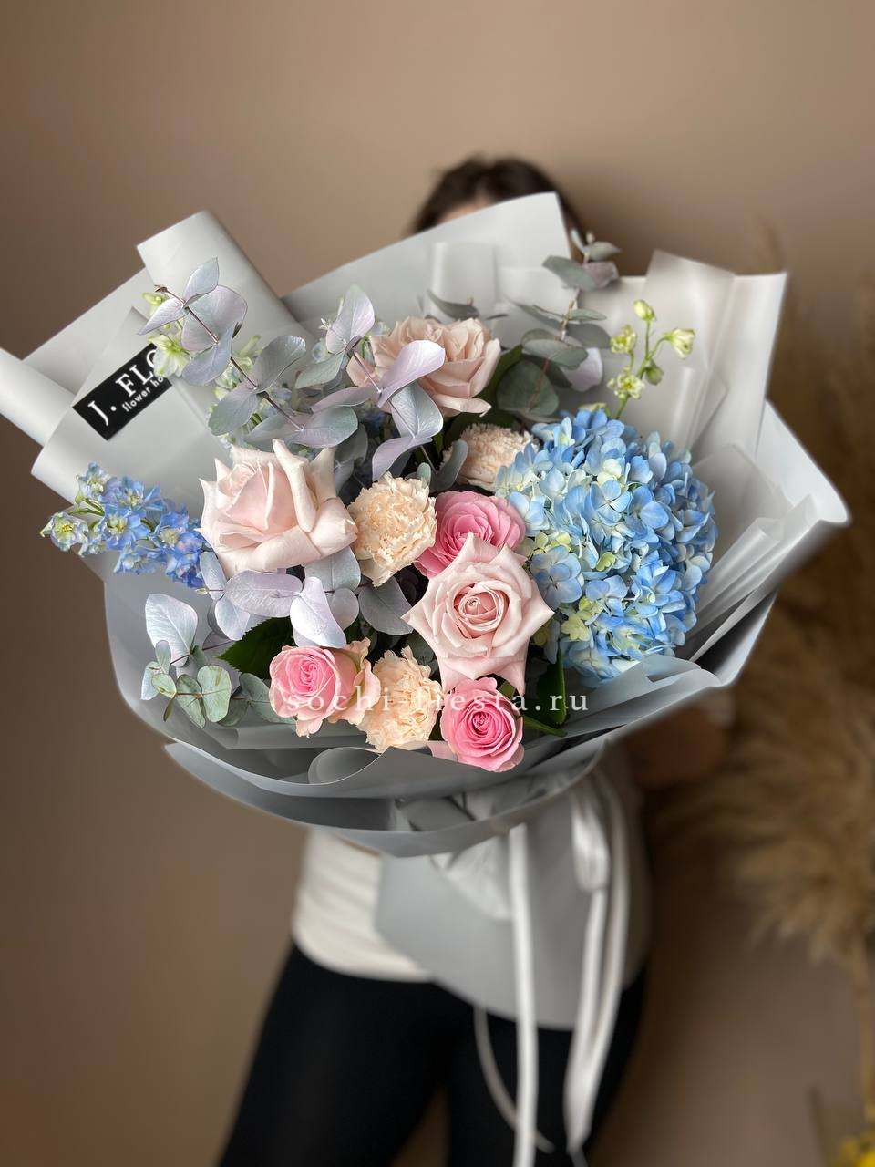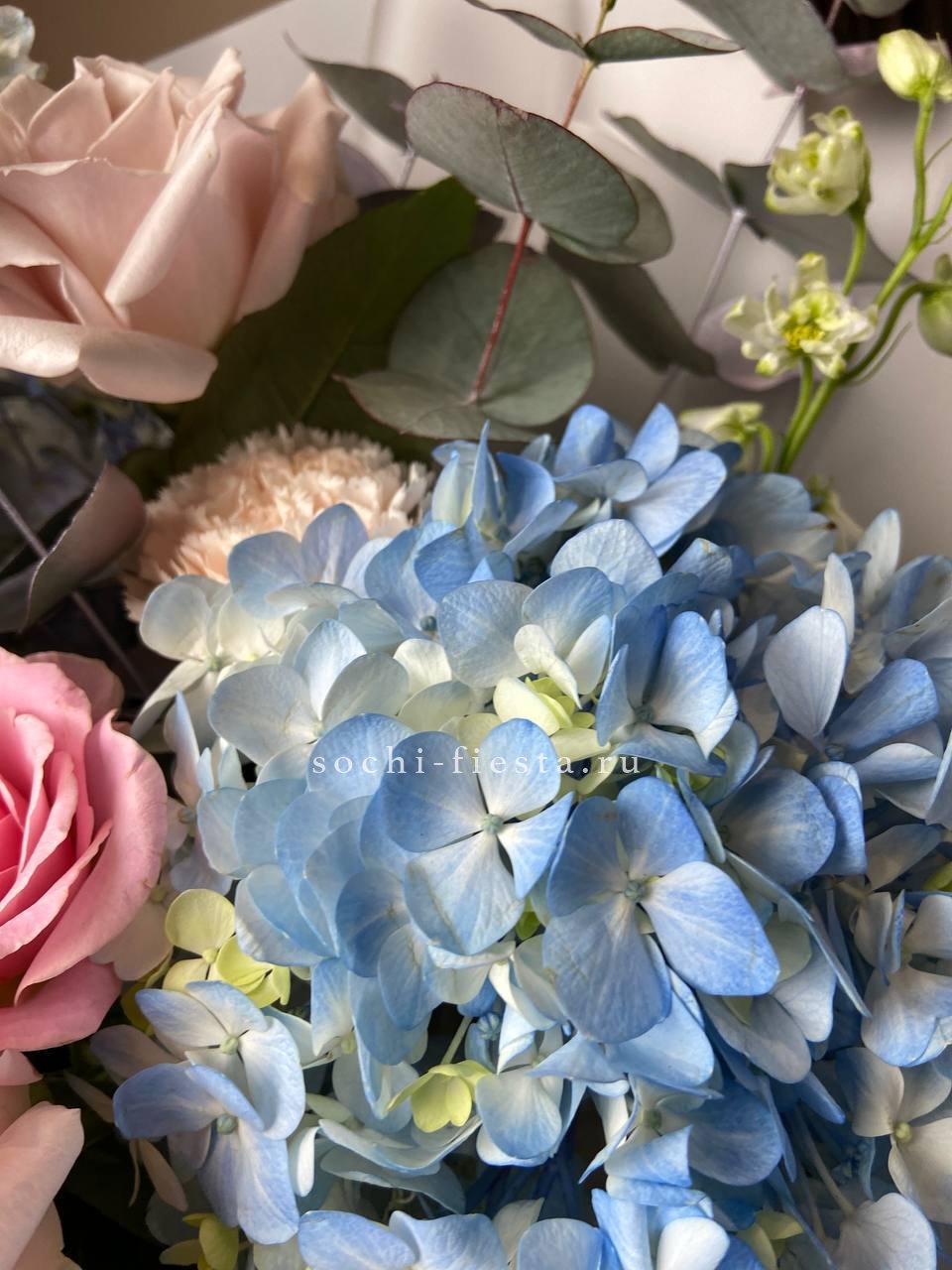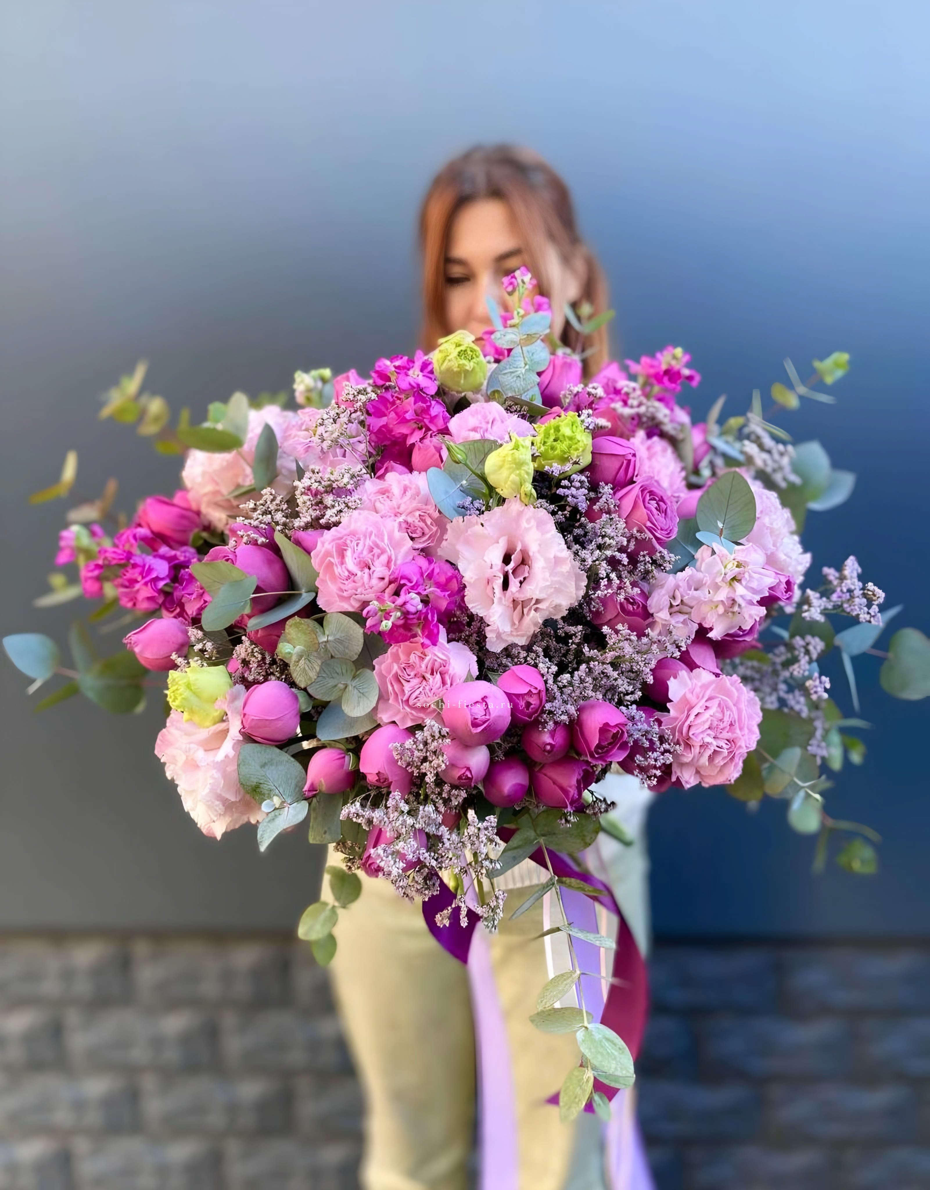 маттиола, диантусы, пионовидные розы Мисти Баблс, эвкалипт, лимониум, эустома лента, упаковка.