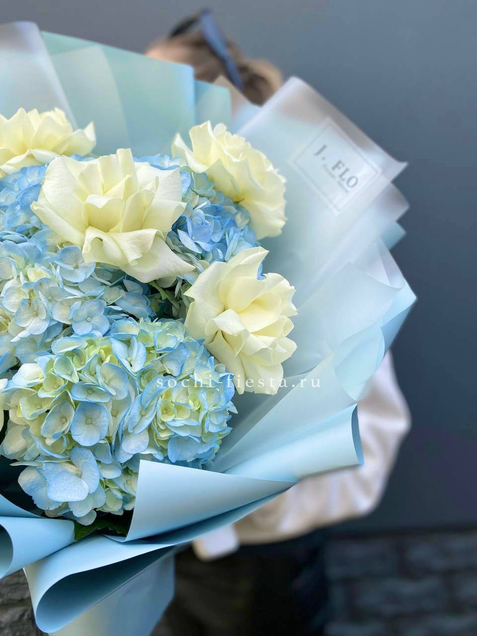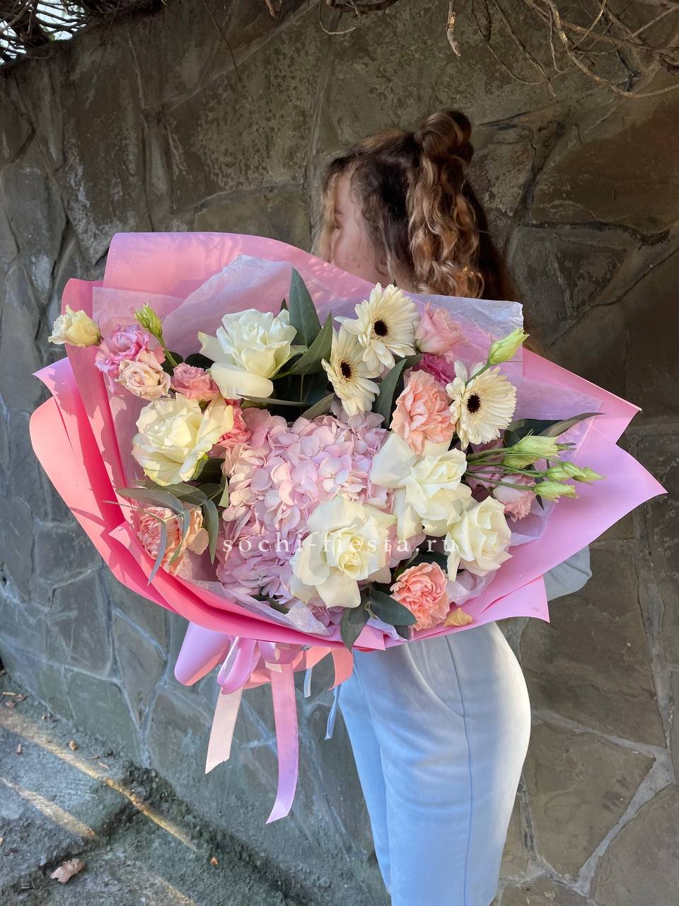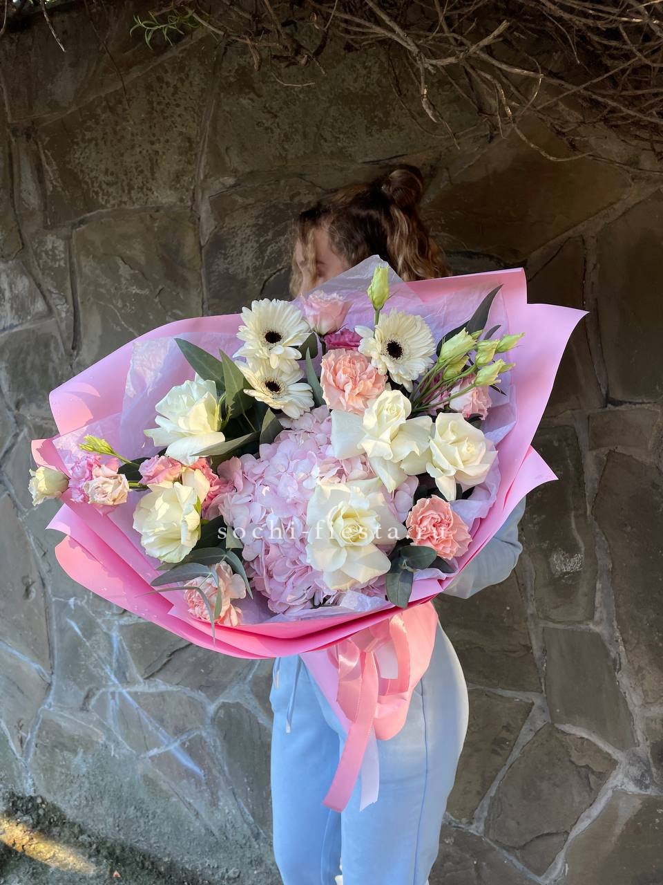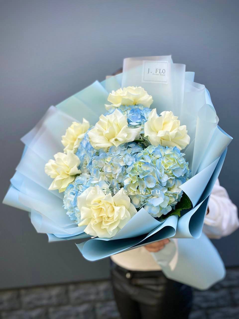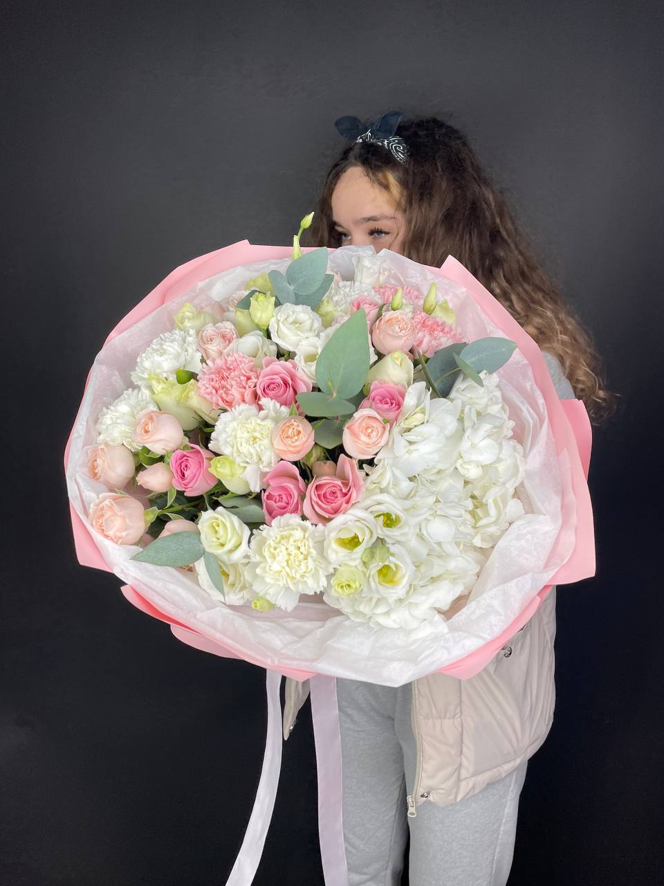 гортензия, диантус, кустовая пионовидная роза, эустома, вспомогательные цветы, эвкалипт, лента, дизайнерская упаковка.