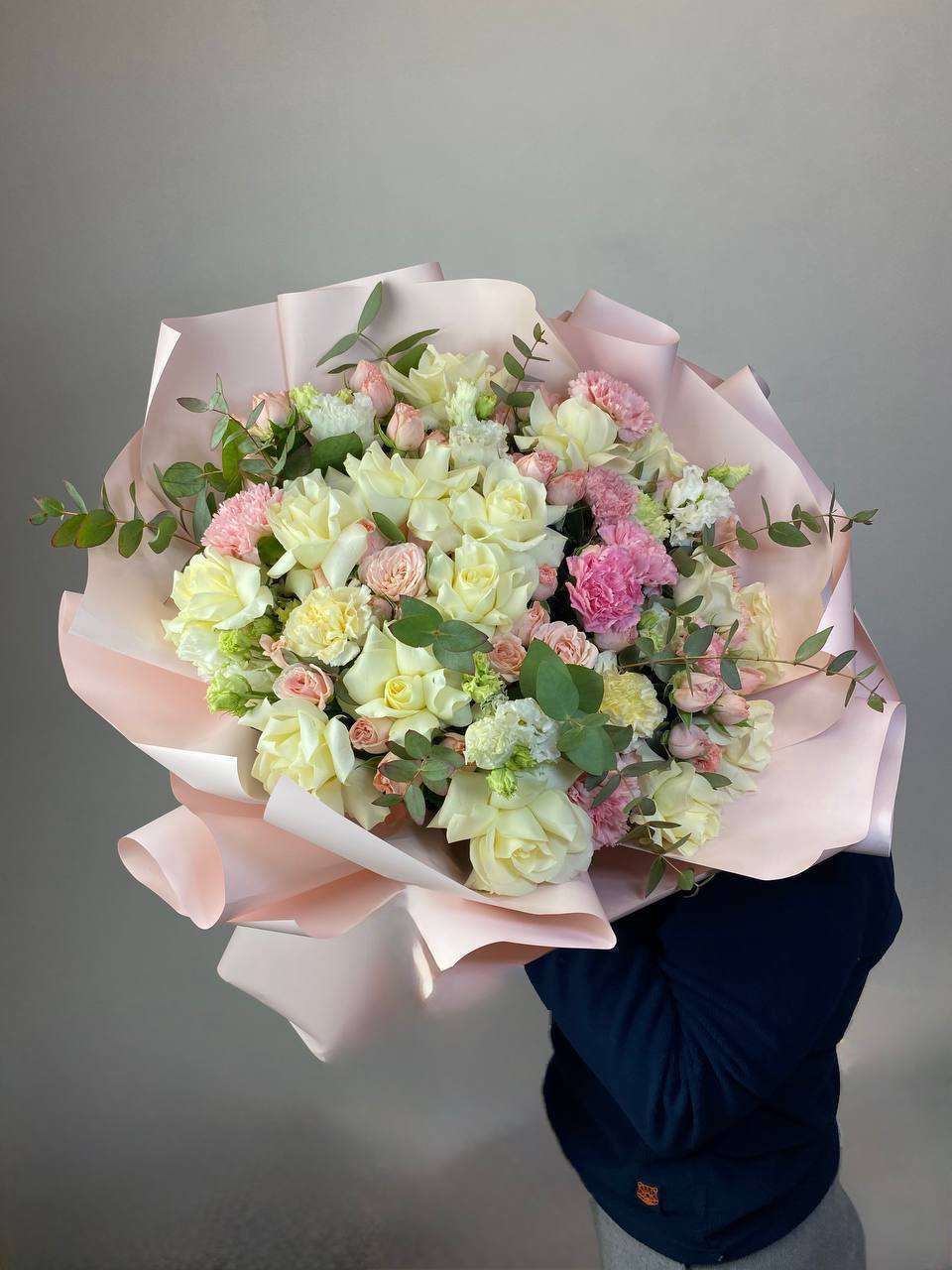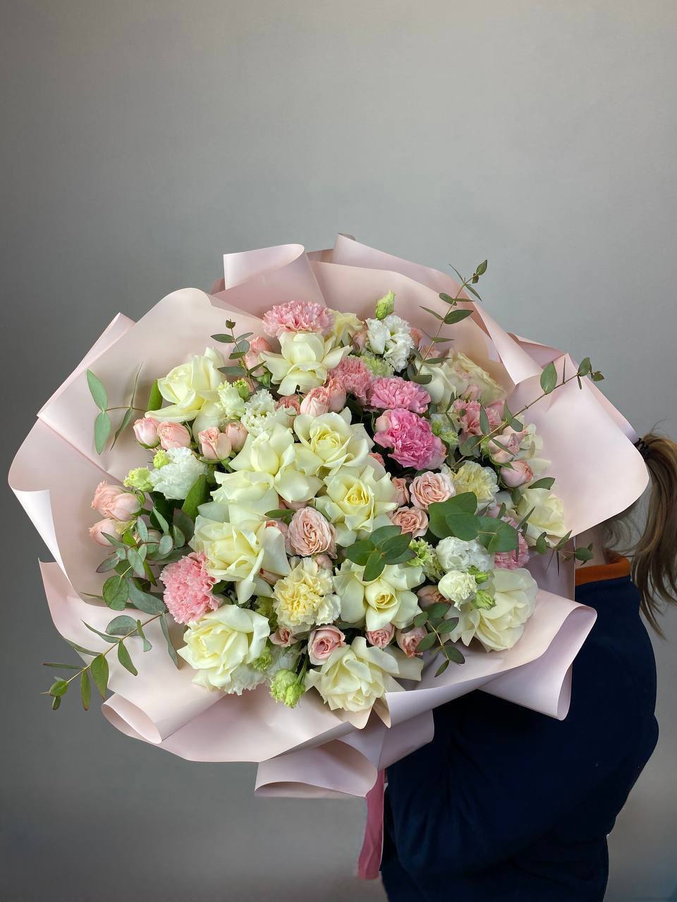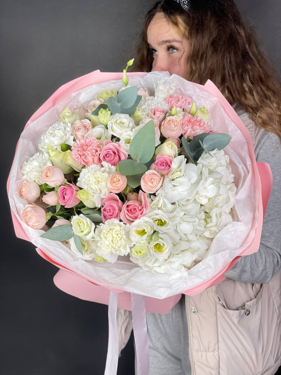 Пионовидные розы и гортензия образуют плотное ядро композиции, а диантус с эустомой разворачиваются по краям. Эвкалипт задает движение и глубину всей формы.
